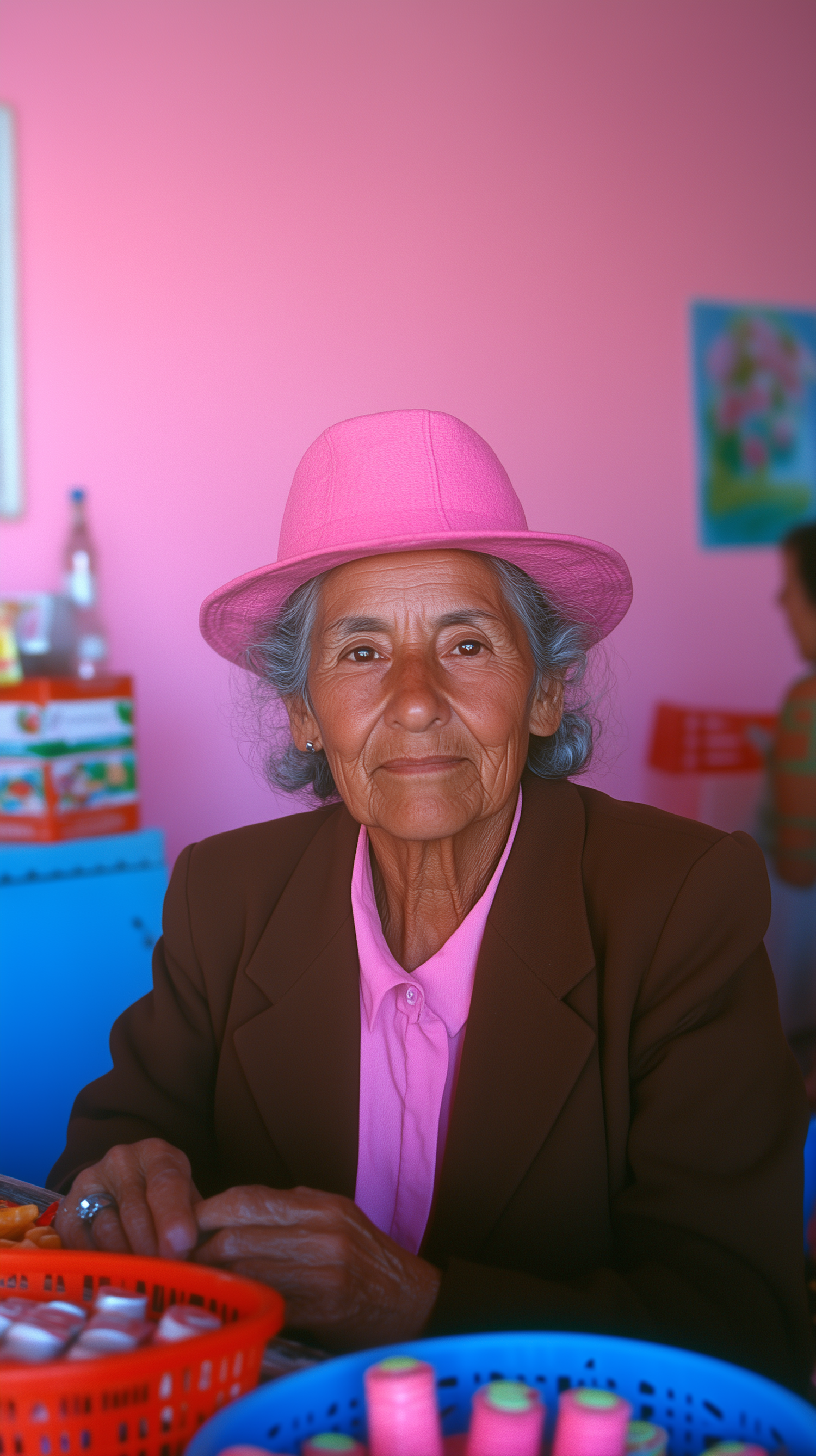 Elderly woman in pink hat and shirt with blurred face, sitting at a table in a vibrant pink setting, exuding style and elegance.
