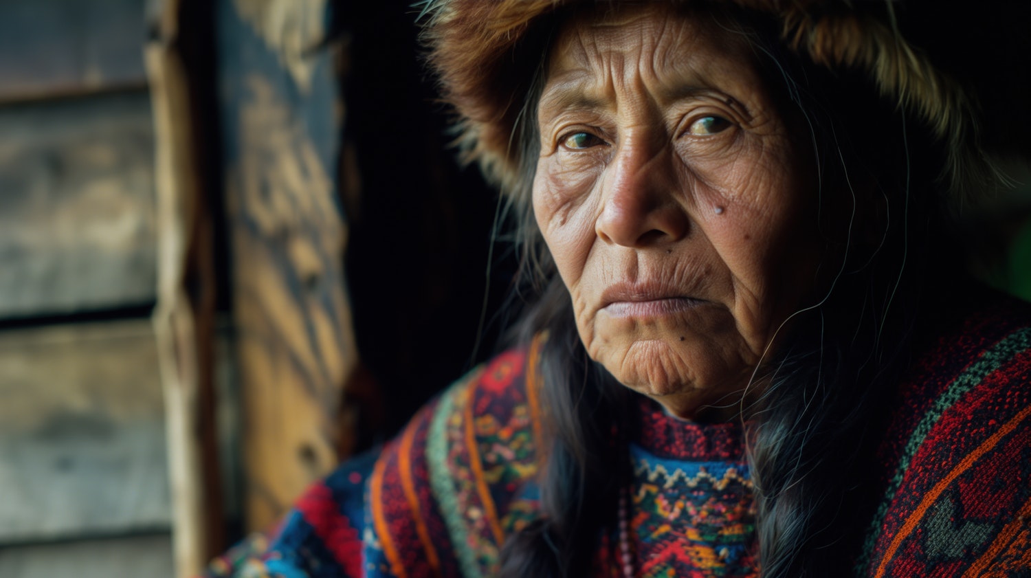 Elderly woman in colorful sweater and fur hat, gazing thoughtfully. Rustic wooden background adds depth to her expressive face.