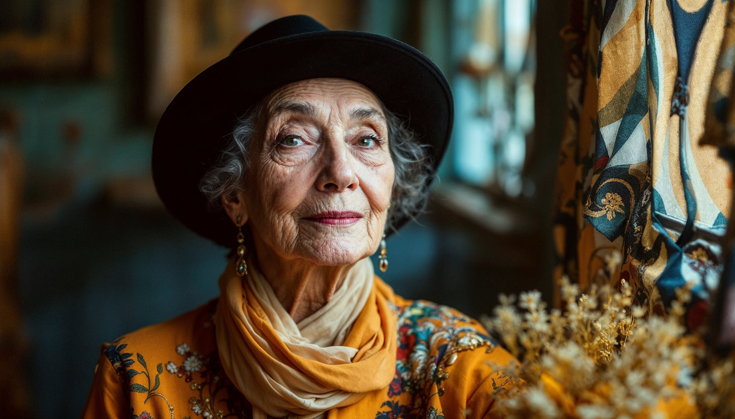 Elegant elderly woman in a black hat and floral blouse, exuding confidence and grace in a warmly lit setting.
