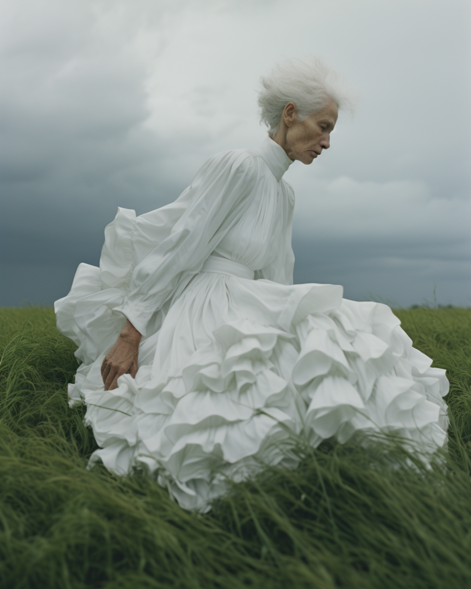 Elderly woman in a flowing white dress stands in a green field under a stormy sky, creating a dramatic and serene scene.