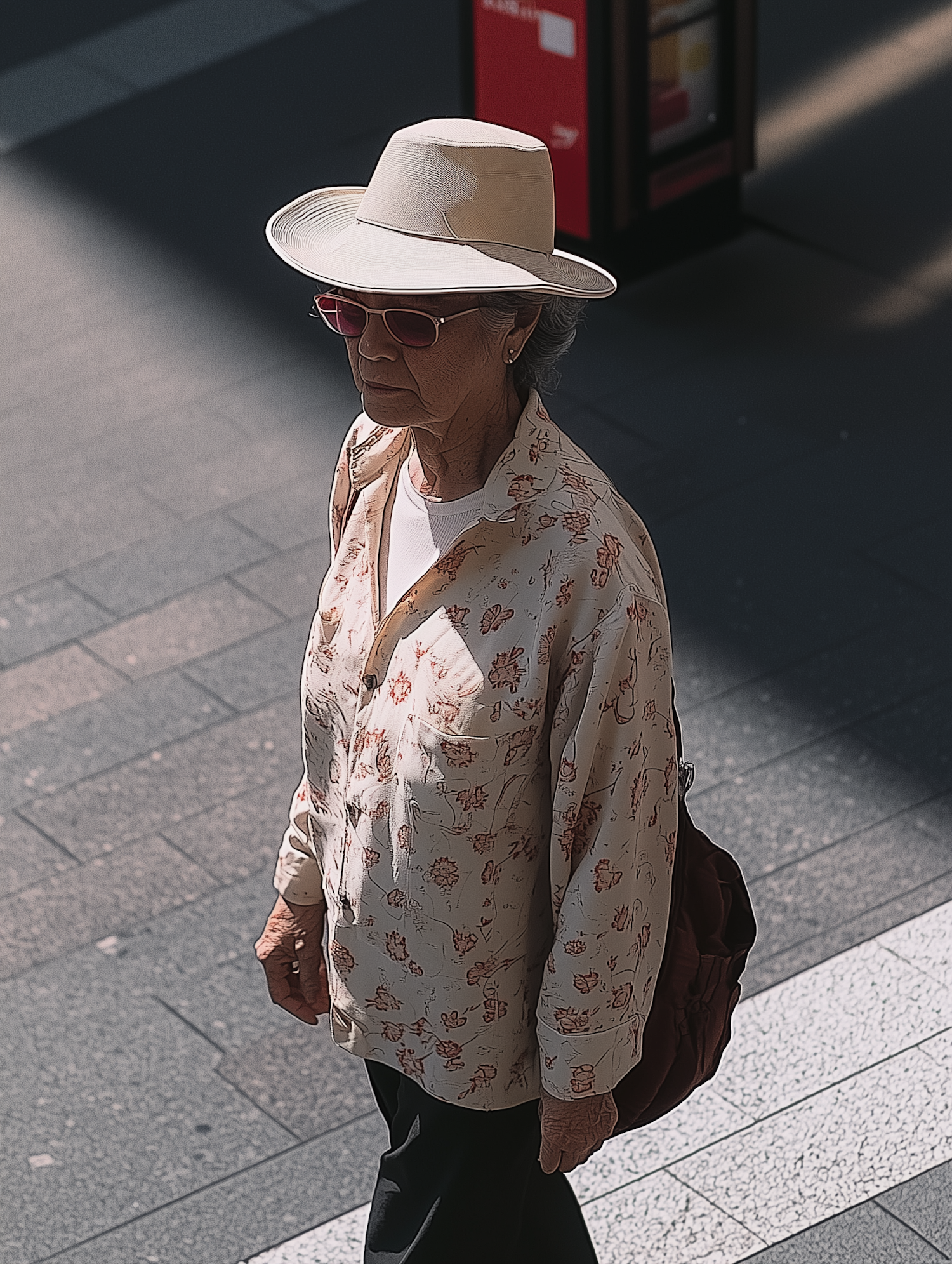 Elderly woman in a beige hat and floral shirt walking on a sunny day, carrying a brown backpack. Urban setting with shadows and tiles.