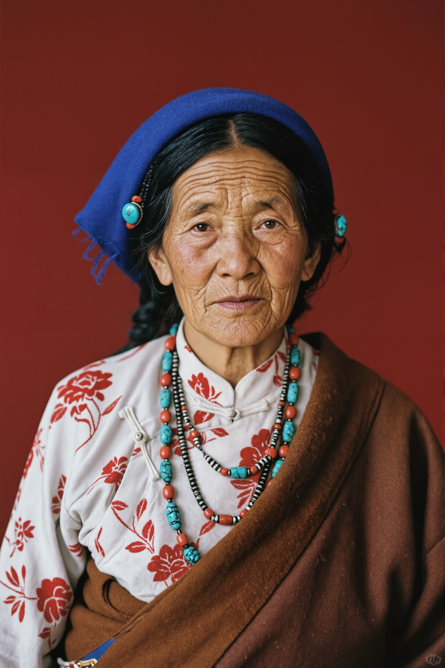 Elderly woman in traditional attire with turquoise and coral jewelry, set against a red background. Her calm expression exudes wisdom.