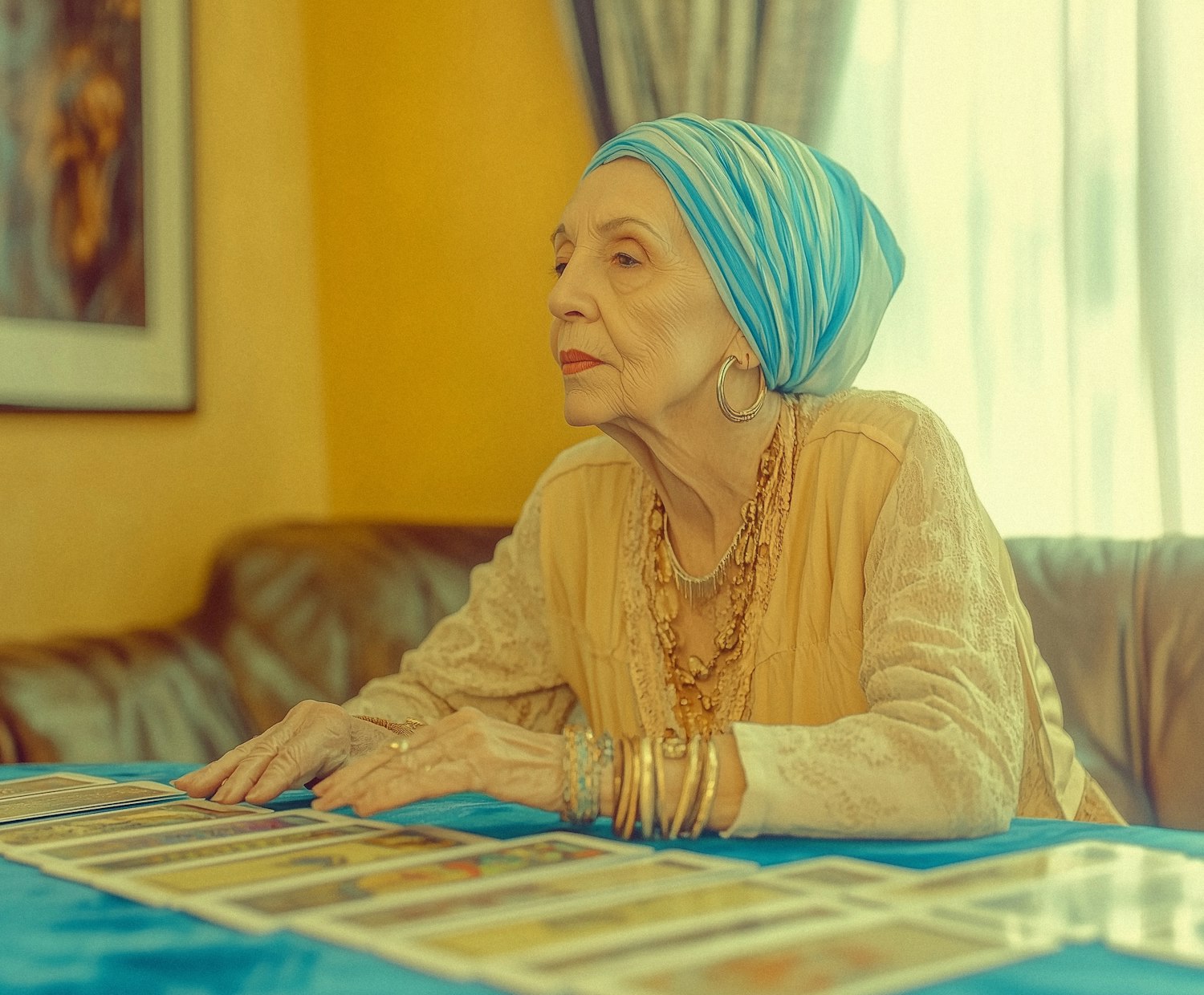 Elderly woman with headscarf reading tarot cards in a cozy room, surrounded by warm colors and mystical jewelry.