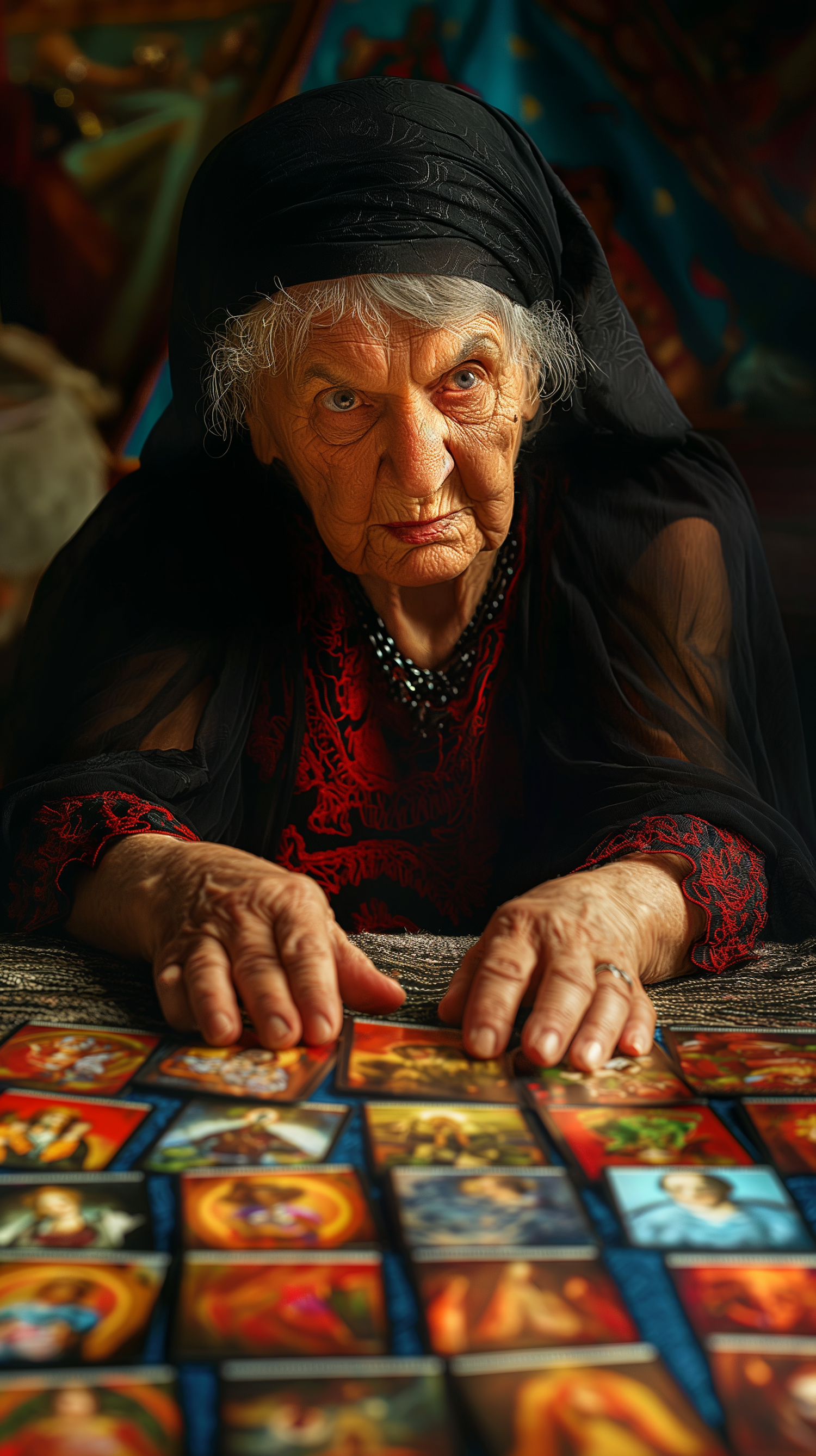 Elderly woman in black headscarf reading colorful tarot cards on a table, creating a mystical atmosphere.