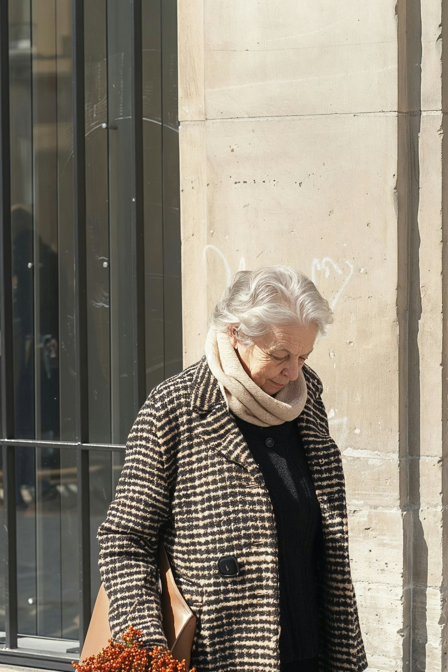 Elderly woman in houndstooth coat and beige scarf, carrying flowers in urban setting.