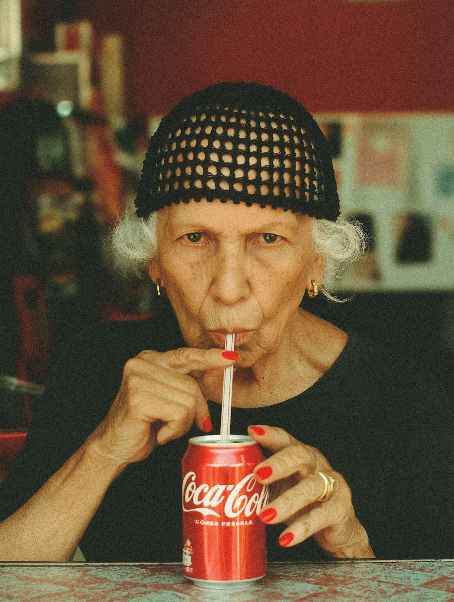 Elderly woman sipping Coca-Cola from a can with a straw, wearing a black cap and red nail polish, in a cozy indoor setting.