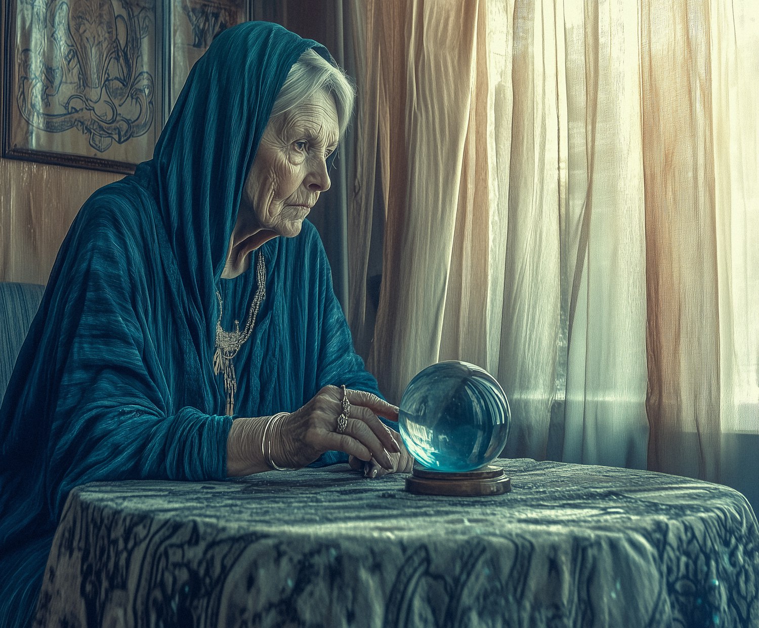Elderly woman in blue hooded garment gazes at crystal ball, surrounded by warm light and mystical ambiance.