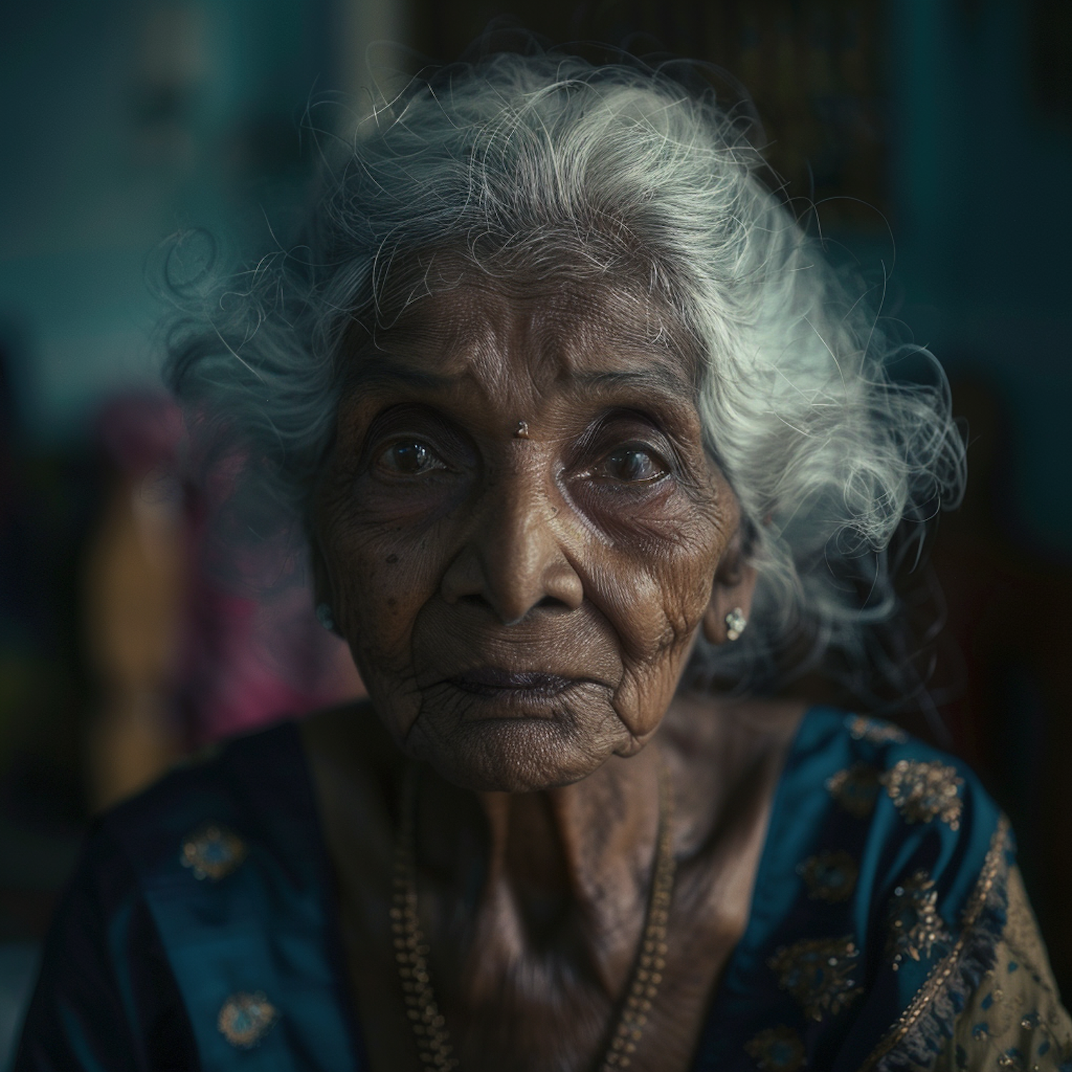 Portrait of an elderly woman with white hair and traditional attire, showcasing deep wrinkles and a contemplative expression.