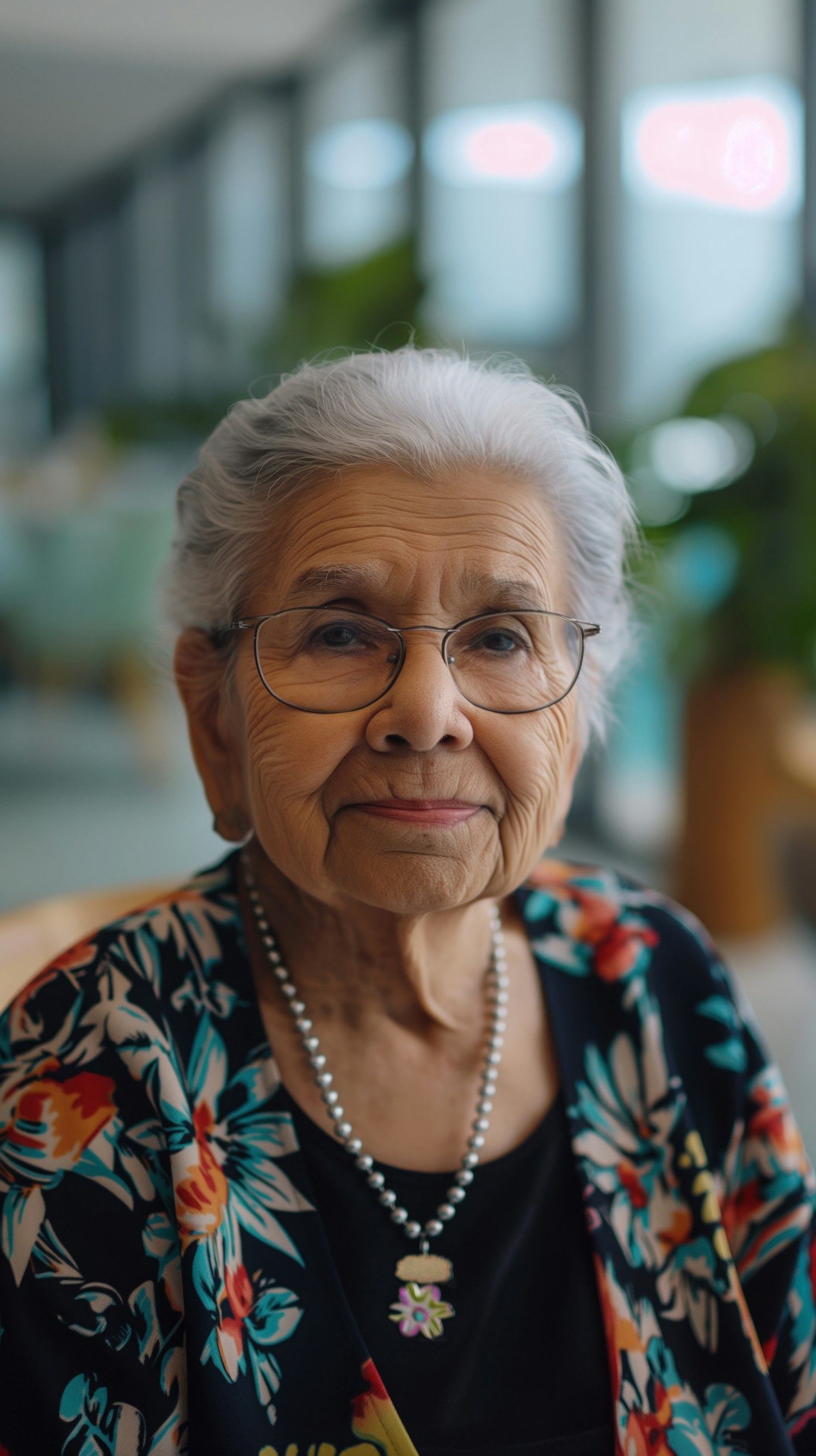 Elderly woman with white hair and glasses, wearing a floral shawl and necklace, seated indoors with a gentle smile.