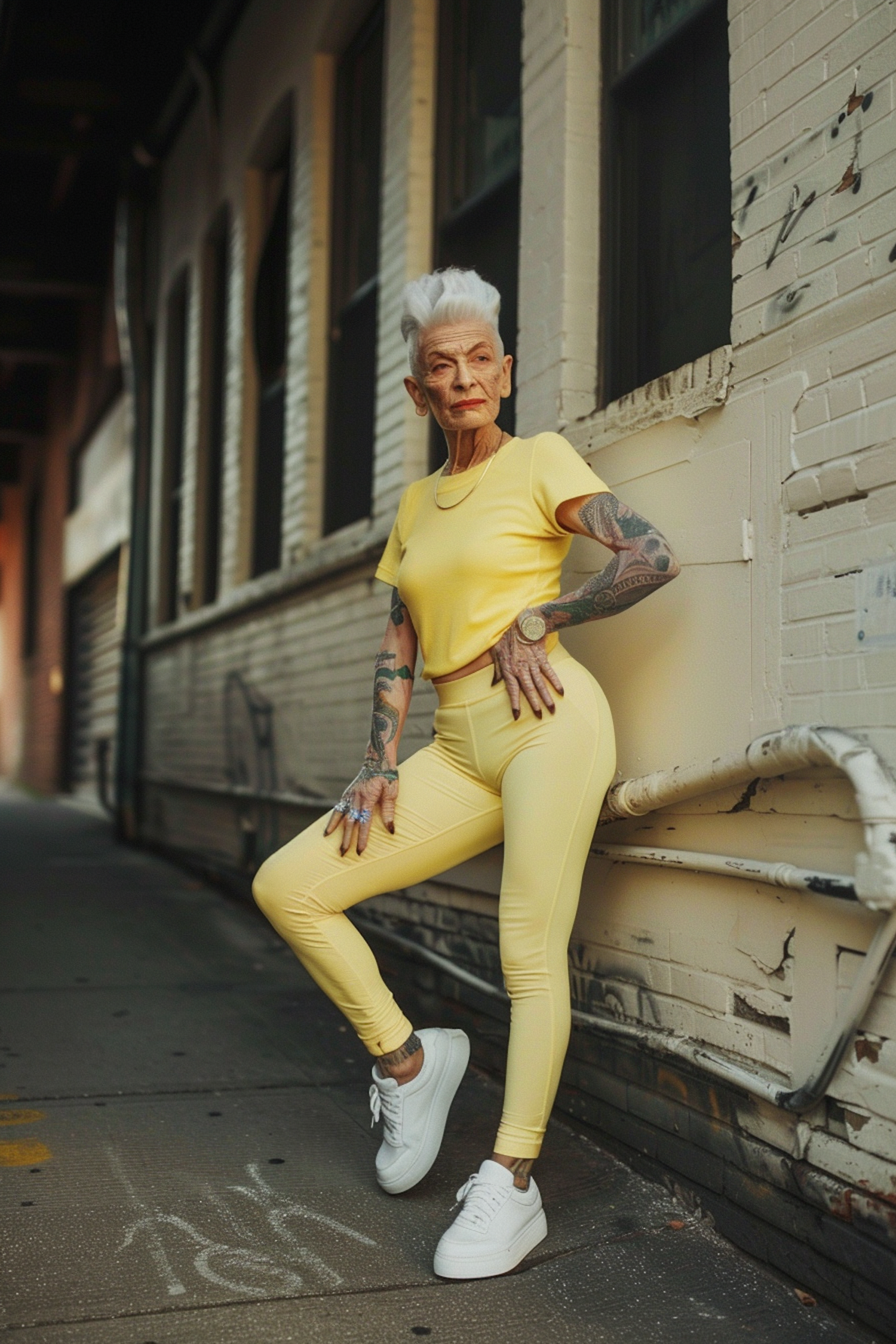 Stylish older woman in yellow outfit with tattoos poses confidently against a brick wall, exuding urban flair and self-assurance.