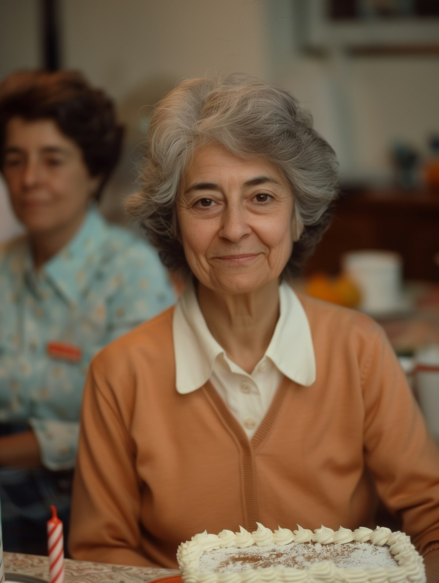 Elderly woman with gray hair and a warm smile sits with a cake, suggesting a celebration. Soft lighting adds a cozy atmosphere.