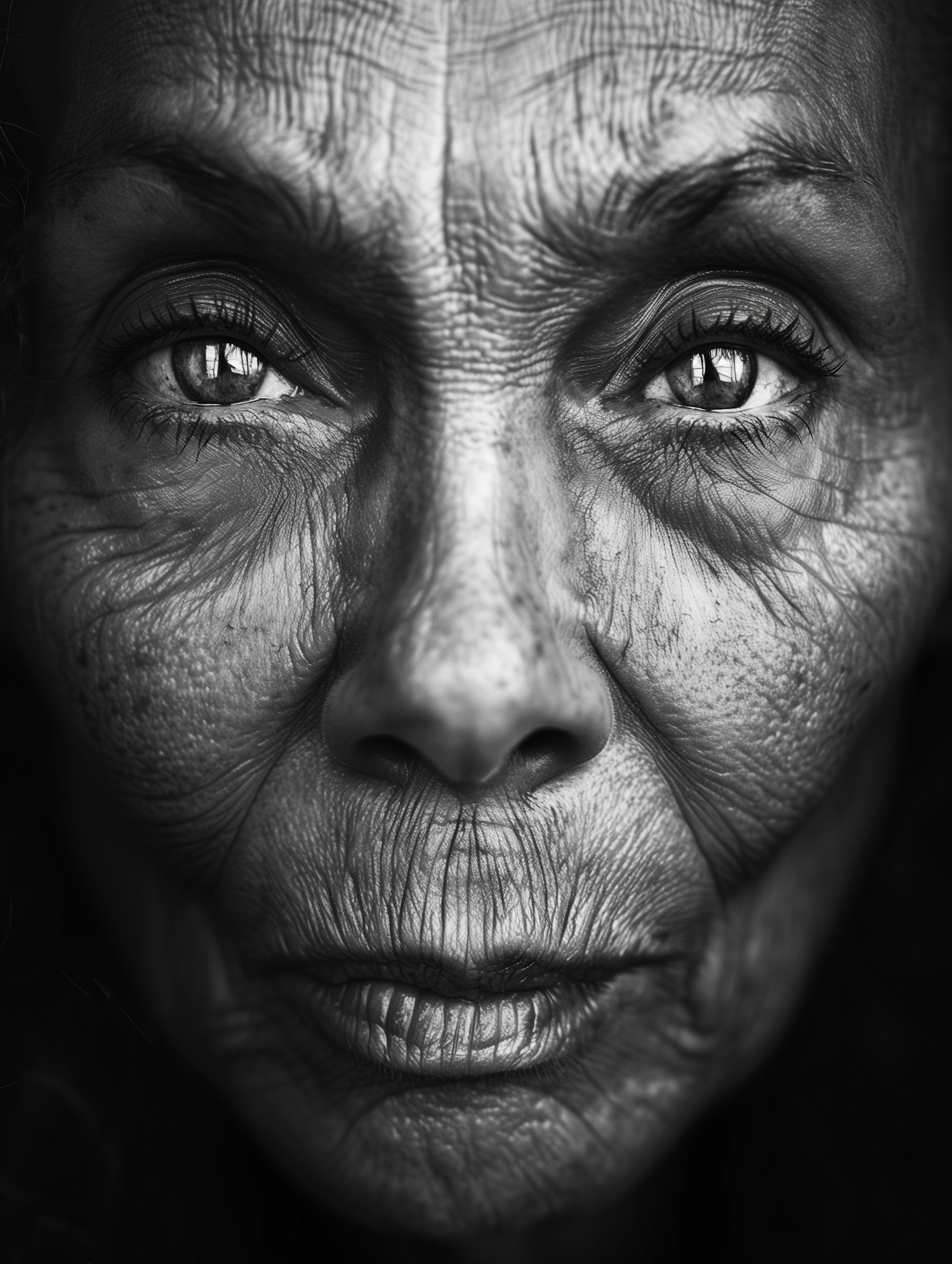 Close-up black and white portrait of an elderly woman with expressive eyes and deep wrinkles, highlighting age and experience.