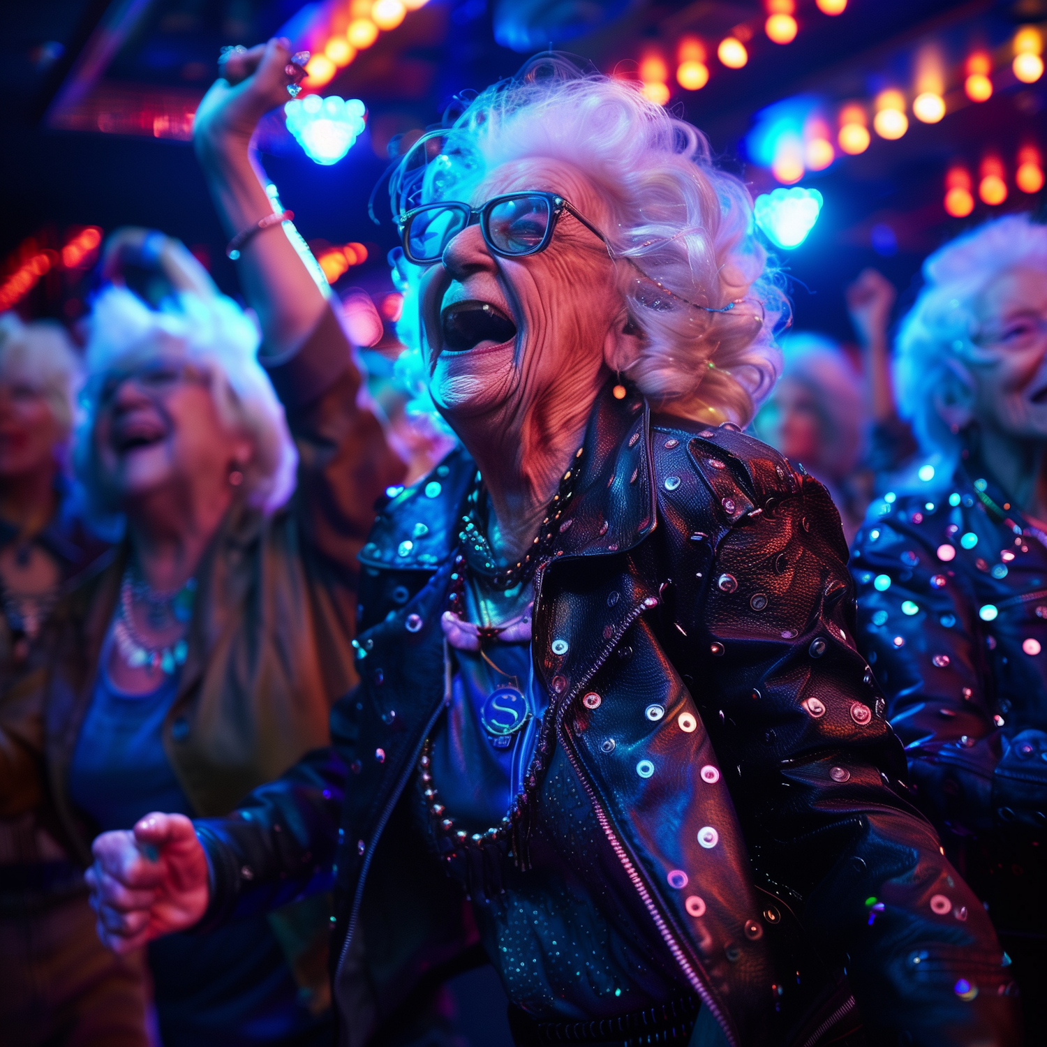 Elderly women in studded jackets enjoy a vibrant night out, dancing under colorful lights with joyful expressions.