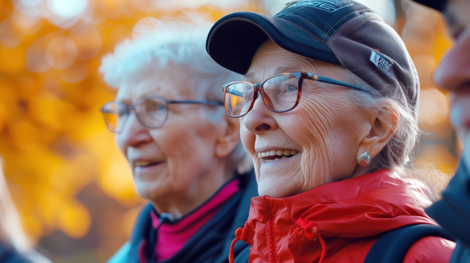 Two elderly women smiling outdoors in autumn, wearing glasses and jackets, surrounded by golden leaves.