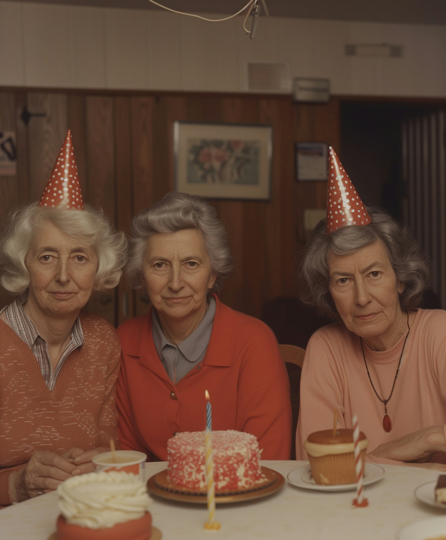 Three elderly women in party hats celebrate with cake and tea, creating a warm, intimate atmosphere. Faces are blurred for privacy.