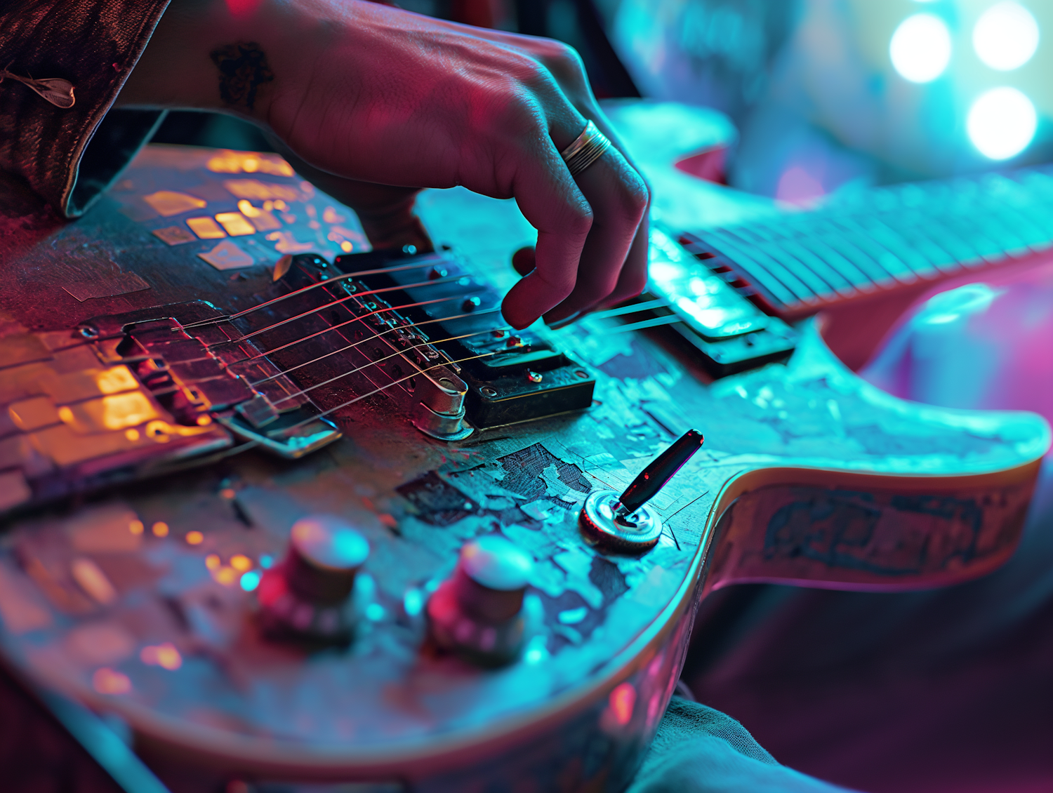 Close-up of a hand playing a mosaic-designed electric guitar under vibrant blue and pink lighting.