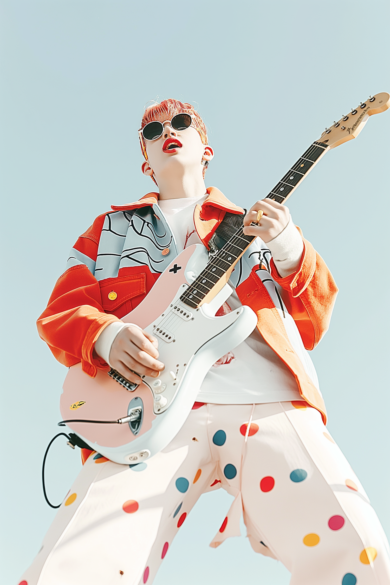 Stylish musician with orange hair and polka dot pants plays a pink electric guitar against a clear blue sky.