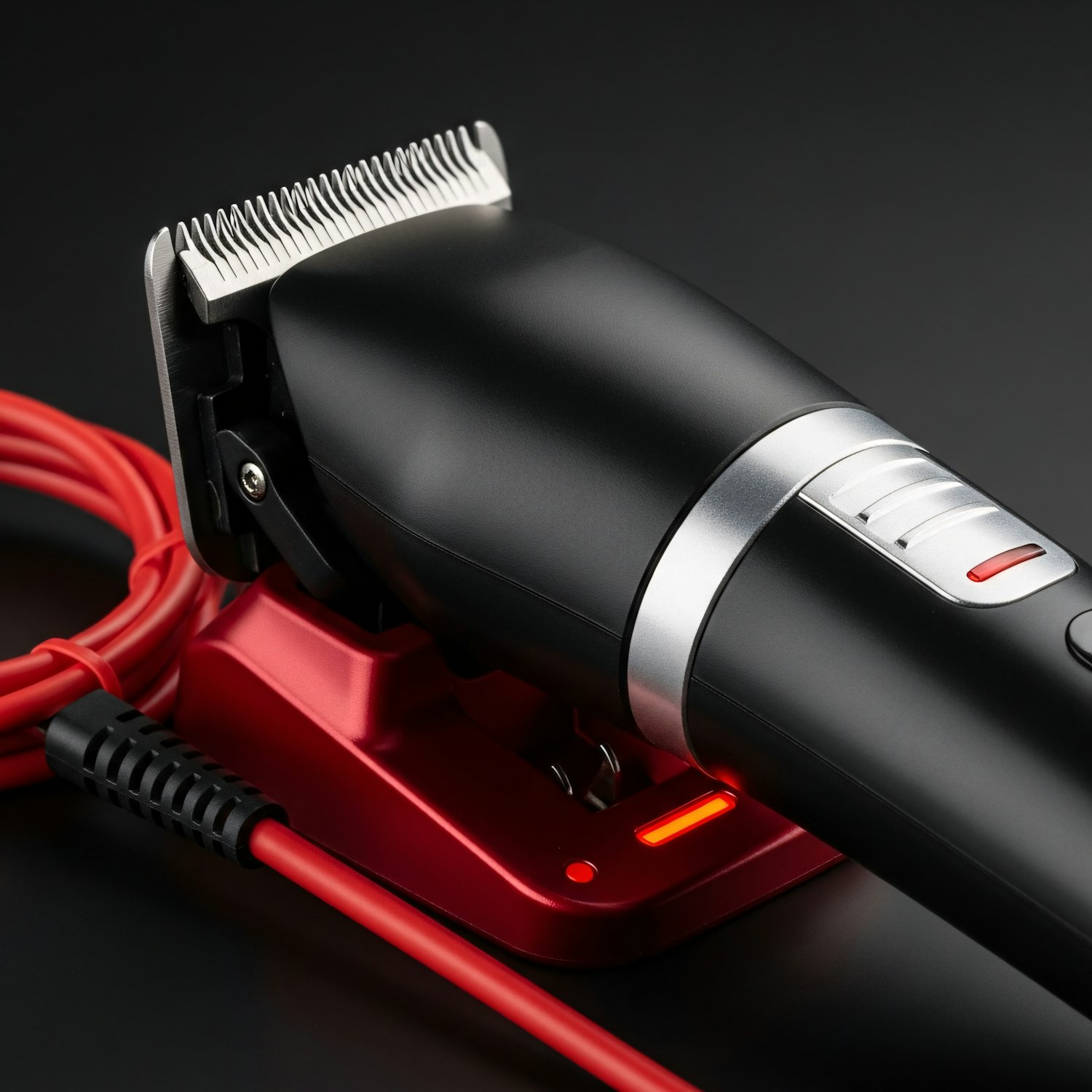 Sleek black electric hair clipper on a red charging dock with a vibrant red cord, perfect for professional grooming needs.