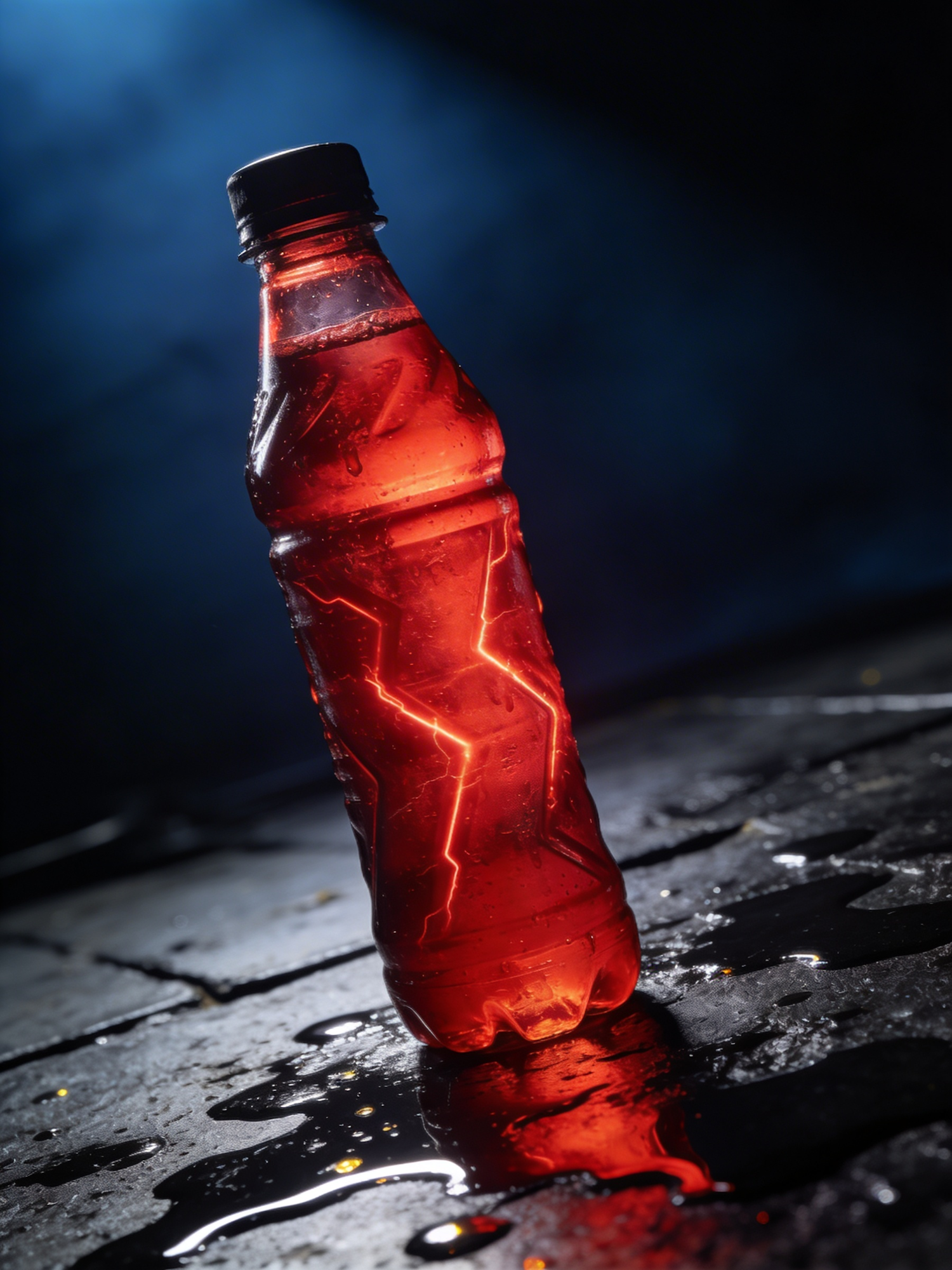 A red beverage bottle with a lightning bolt design, standing on a wet surface under dramatic lighting, creating a bold and dynamic look.