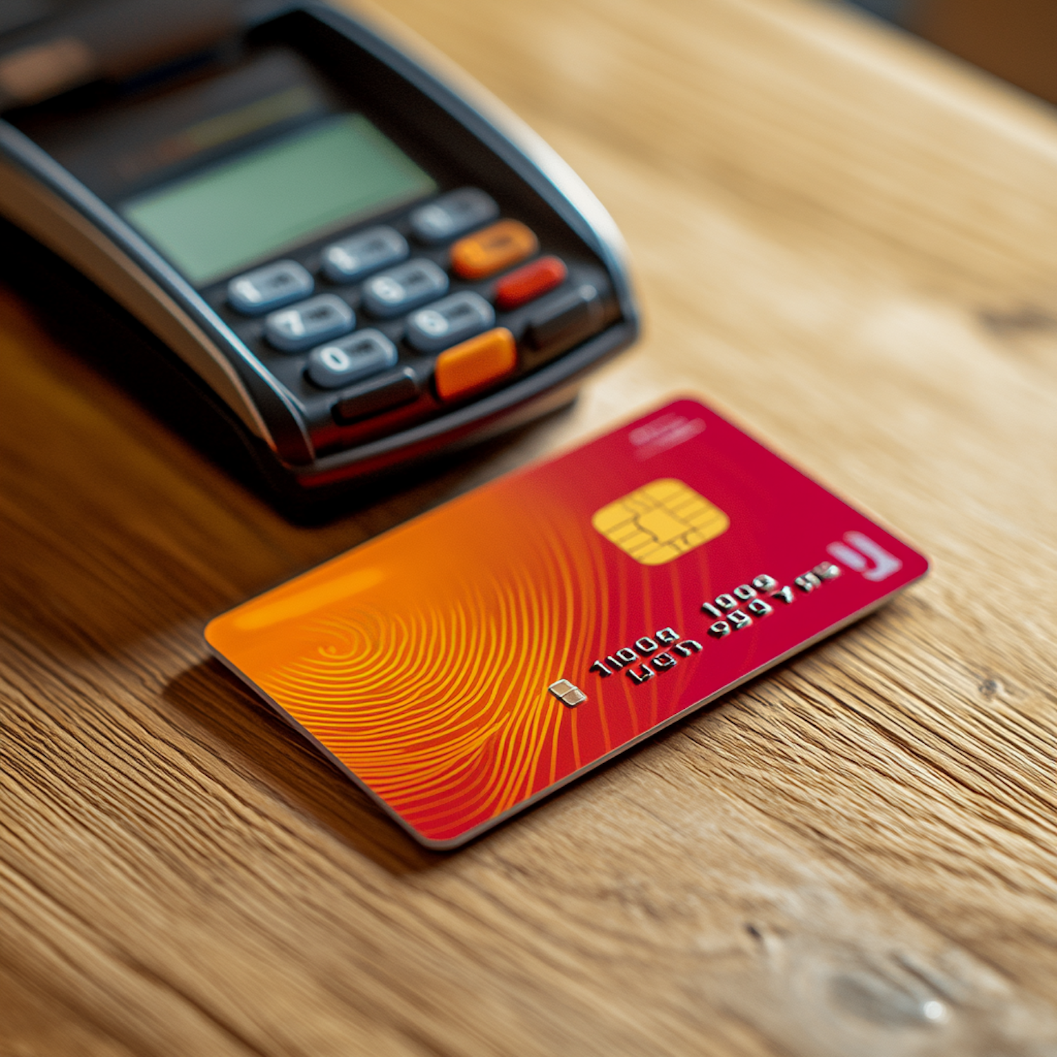 Close-up of a red and orange credit card with a chip on a wooden table, next to a black payment terminal.