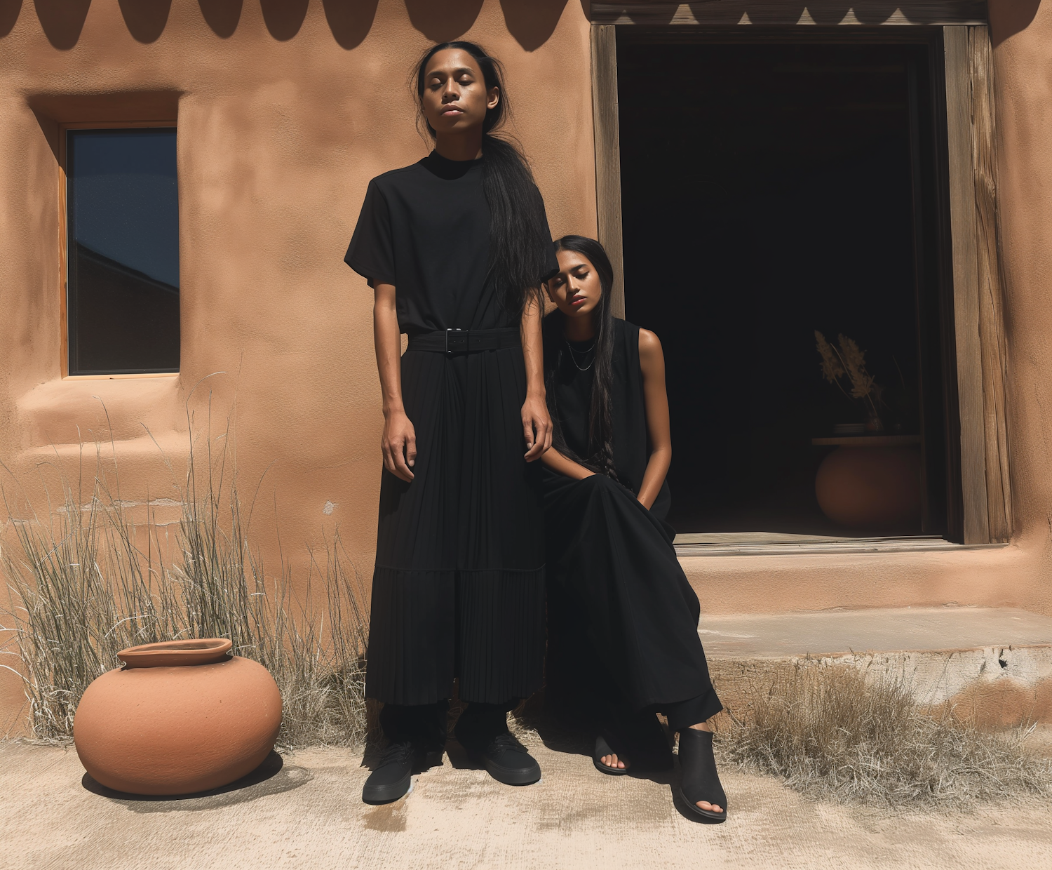Two individuals in black attire pose against a rustic building with clay pots and dry grass, creating a serene, earthy aesthetic.