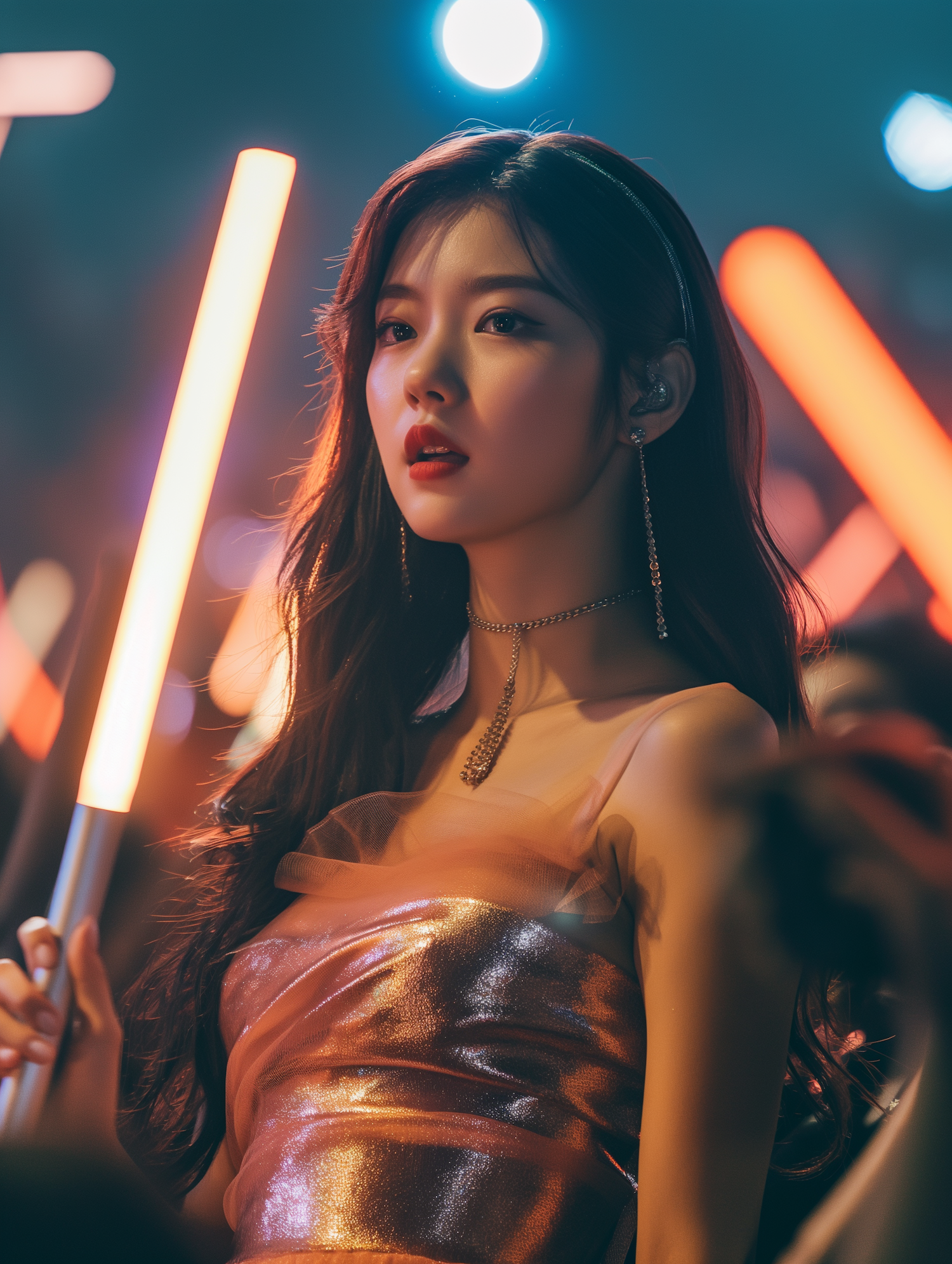 Asian woman in a metallic dress holding a glowing light stick, surrounded by vibrant lights and a lively atmosphere.
