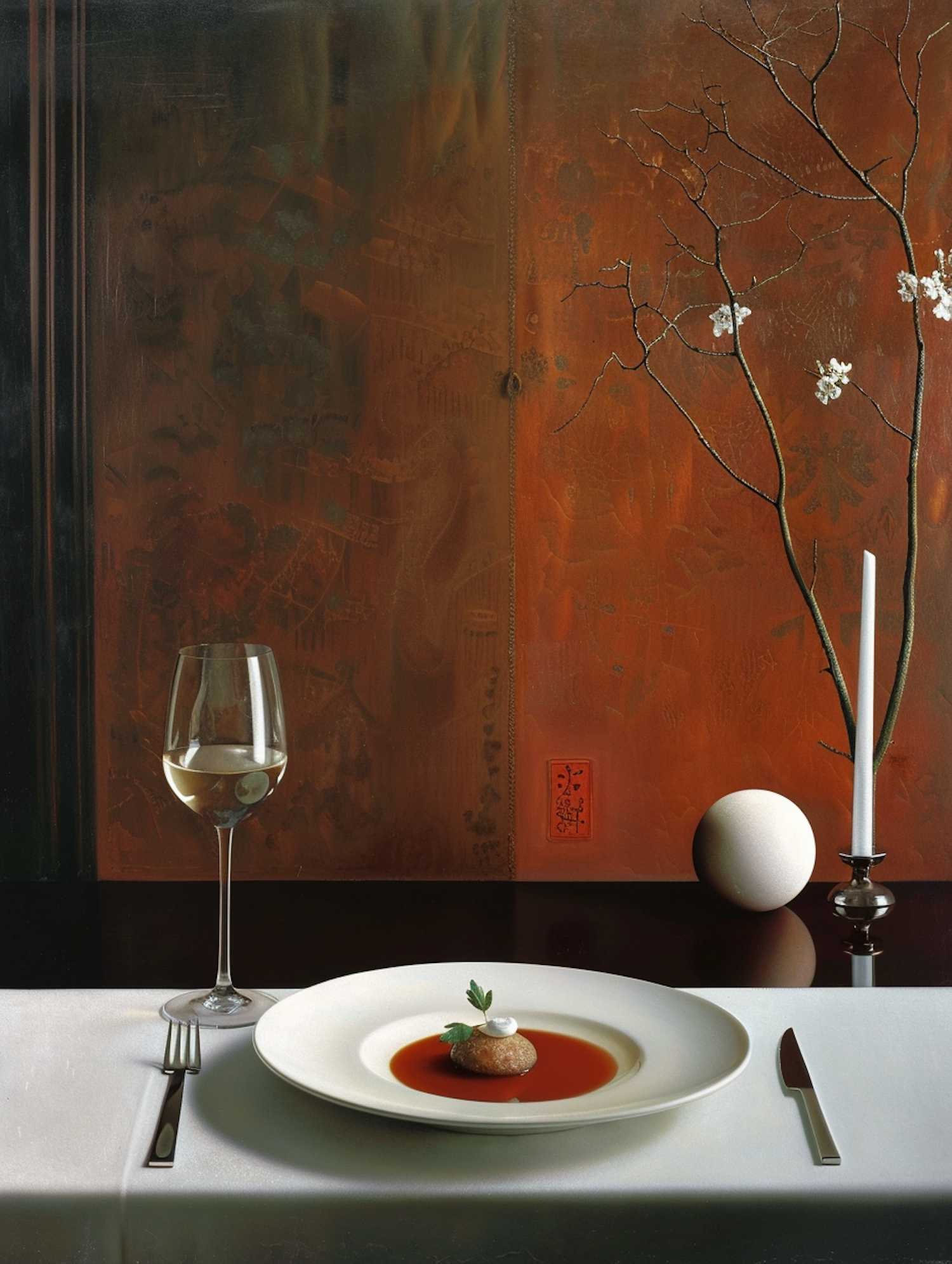 Elegant dining setup with a gourmet dish, wine glass, and floral decor against a rich brown background.
