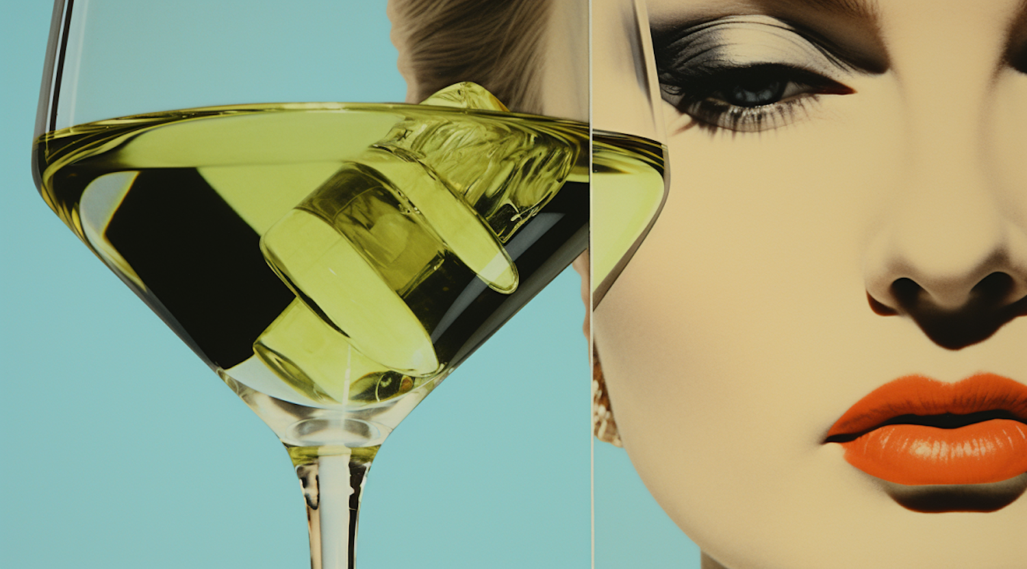 Stylish composition of a woman's face with bold makeup and a martini glass with yellow liquid, set against a soft blue background.