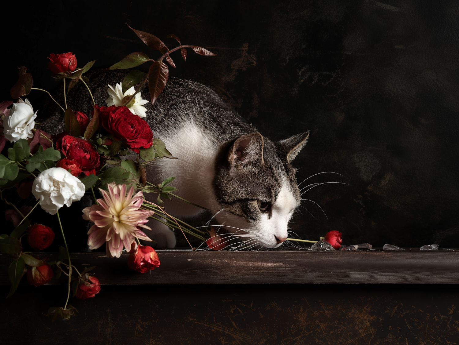 A curious tabby cat sniffs a red rose amidst a lush floral arrangement on a dark background.