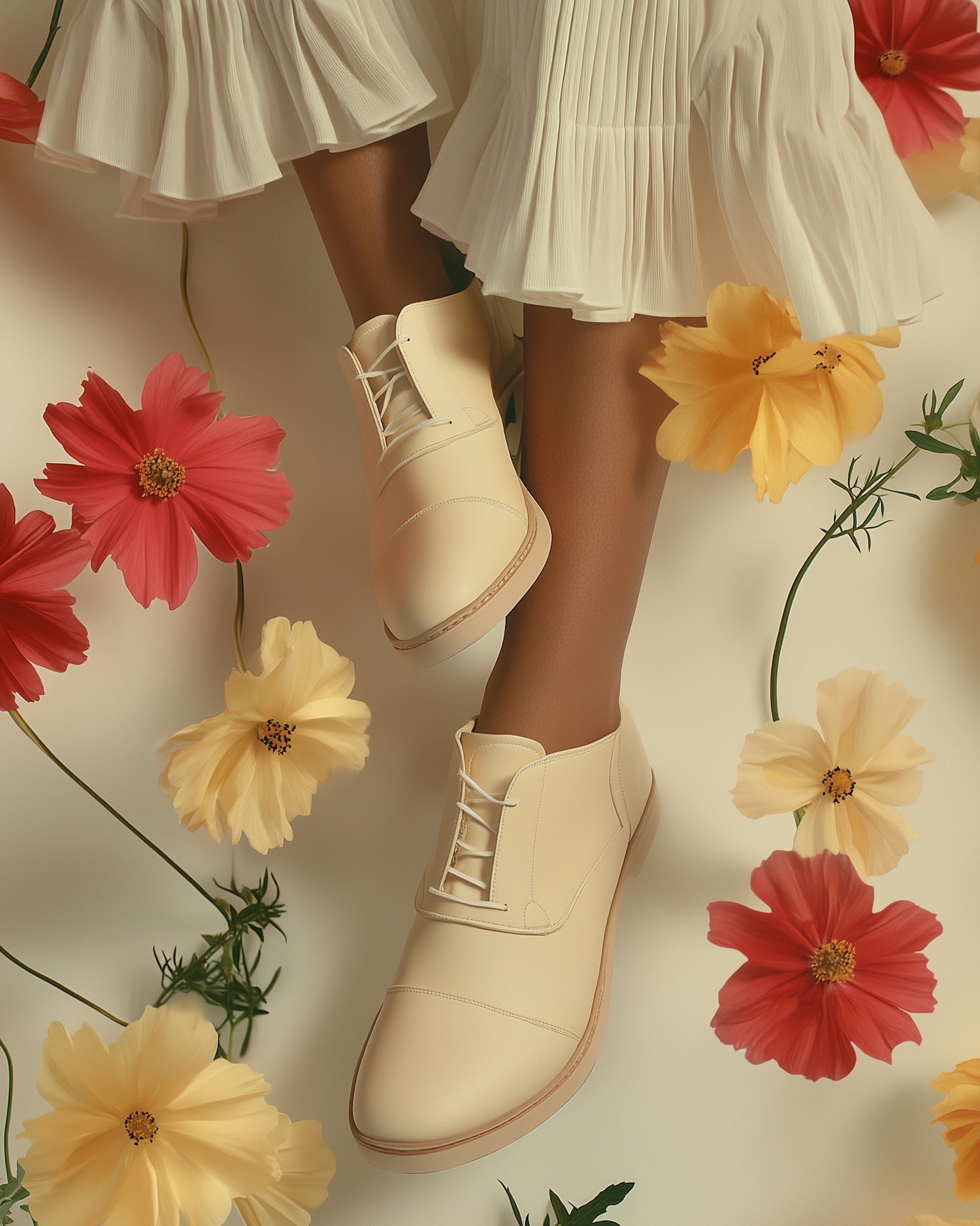 Elegant beige shoes paired with a white pleated skirt, surrounded by vibrant red and yellow flowers for a fresh, stylish look.