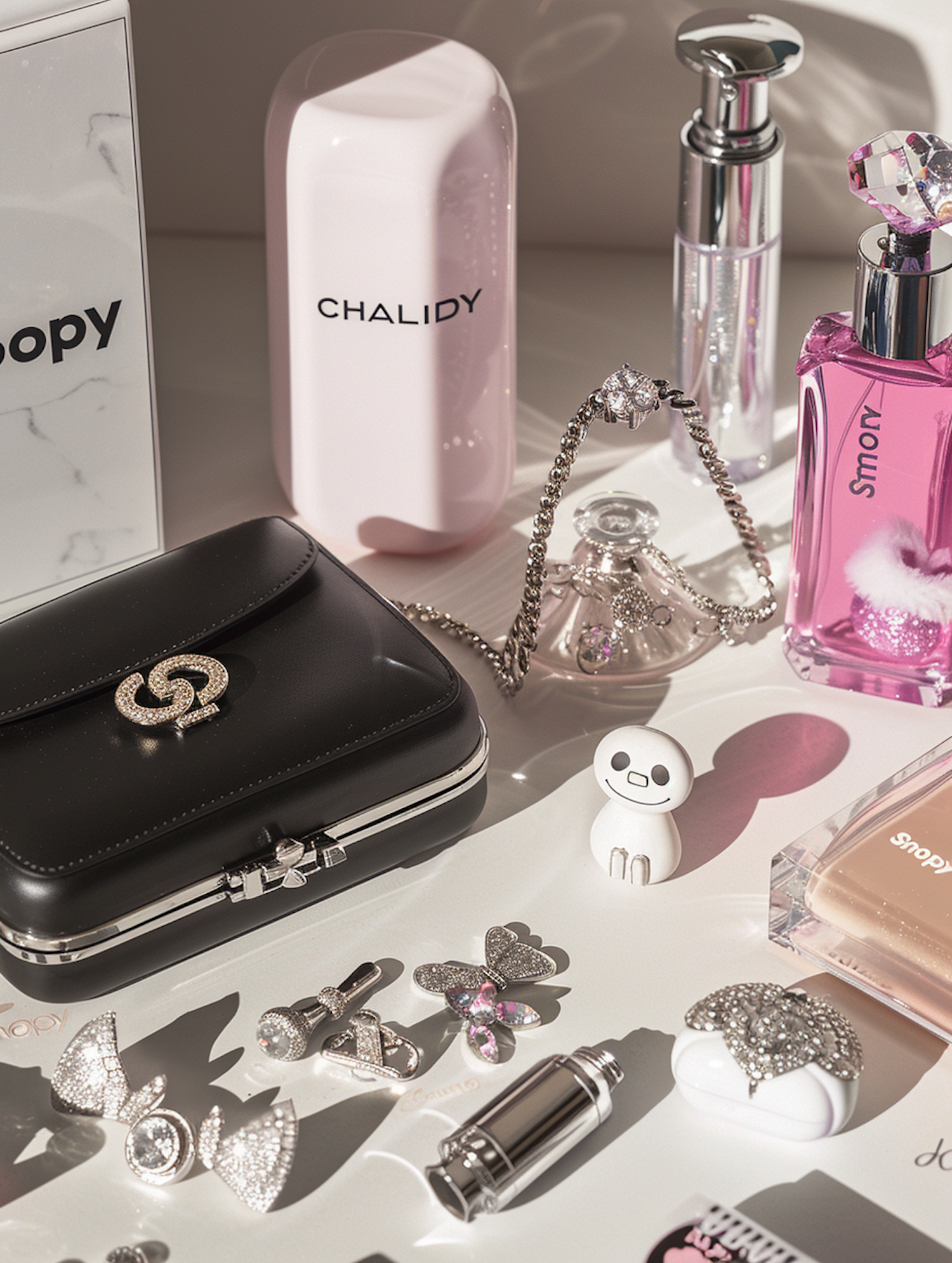 Elegant display of luxury items including a black clutch, pink perfume, jewelry, and a whimsical figurine on a white surface.