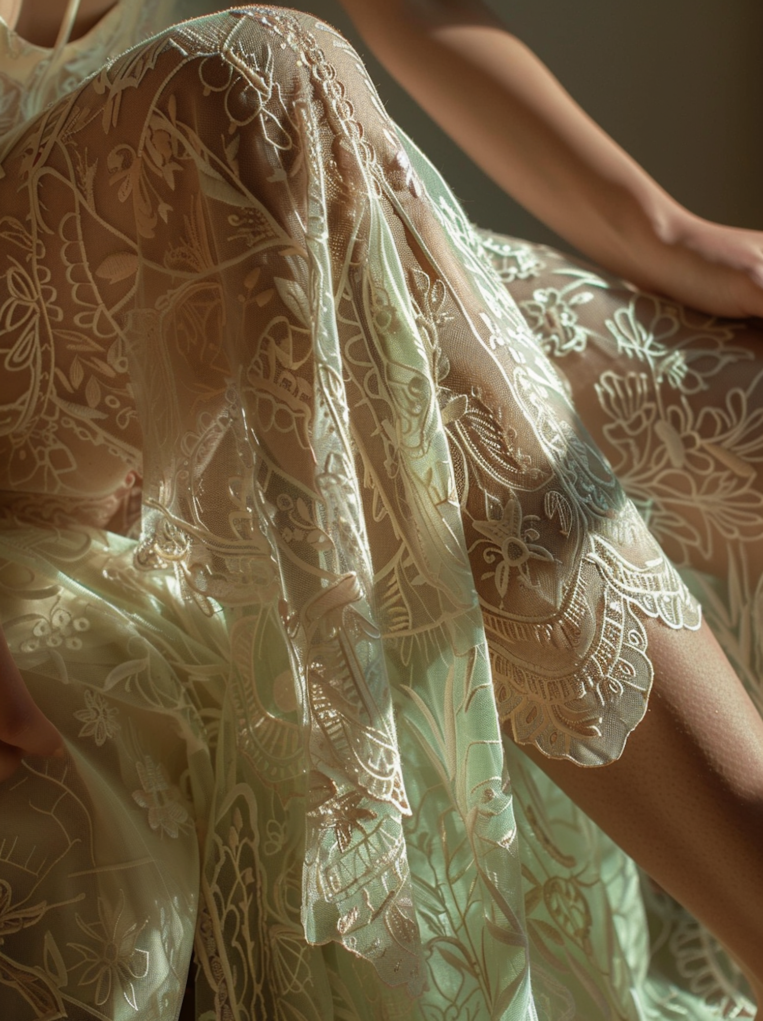 Close-up of sheer fabric with floral embroidery draped over a leg, showcasing intricate details and soft lighting.