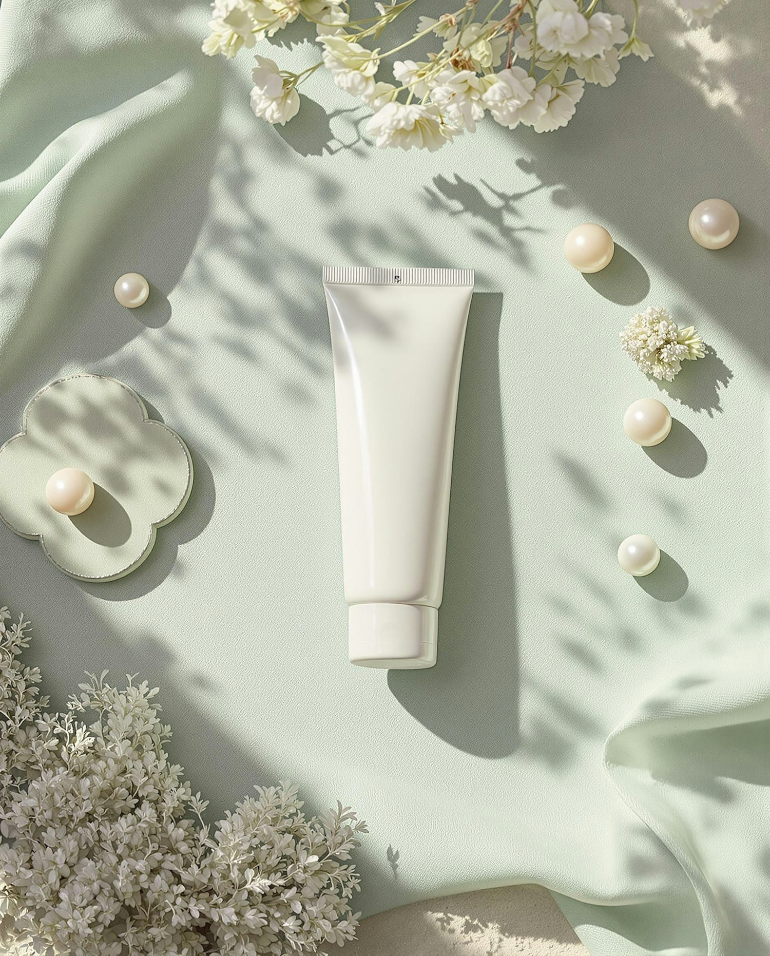 Elegantly arranged cosmetic scene with a white tube, pearls, and delicate floral accents on a soft pastel backdrop.