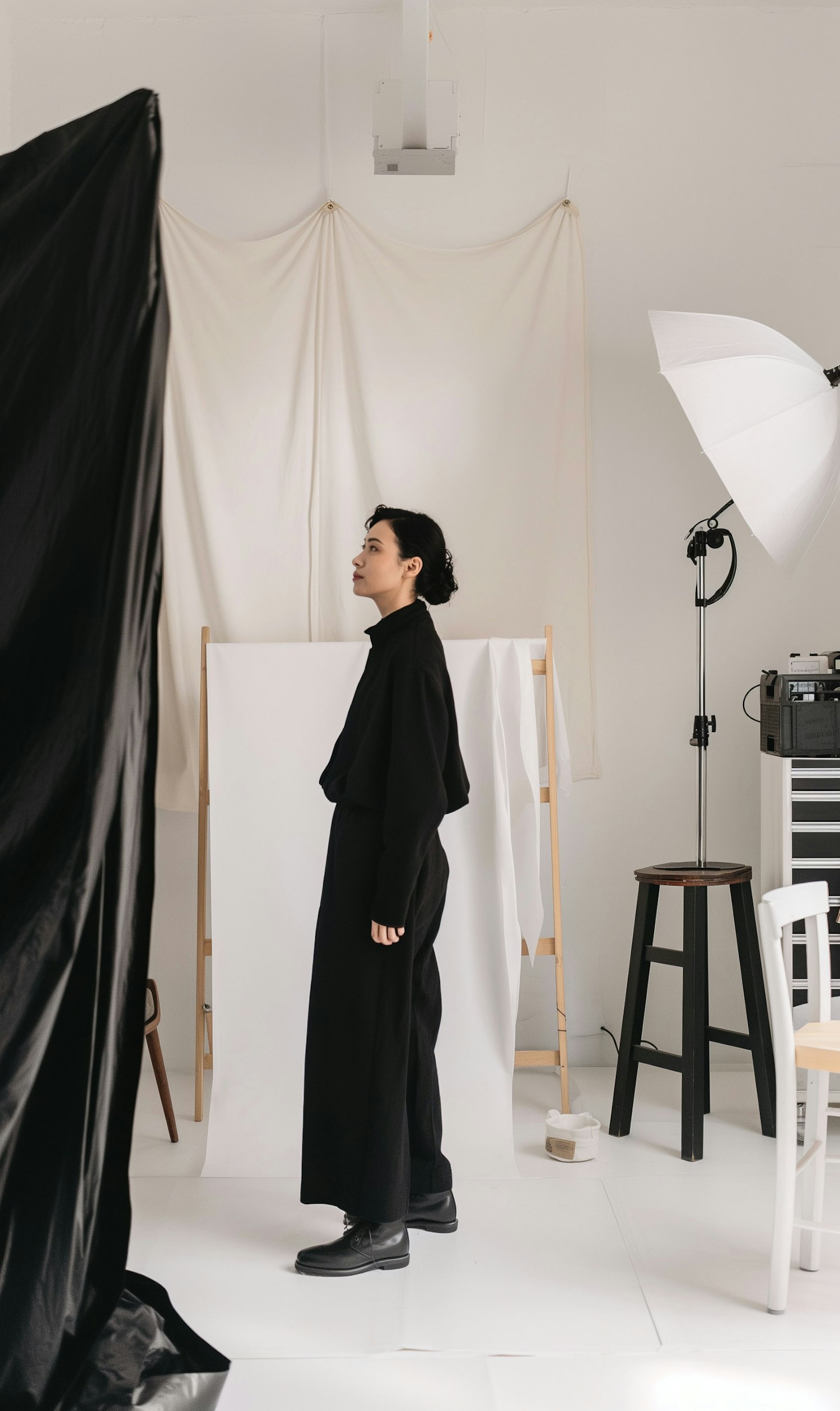 Asian woman in black dress in a photography studio with white backdrop and softbox lighting, exuding minimalist elegance.