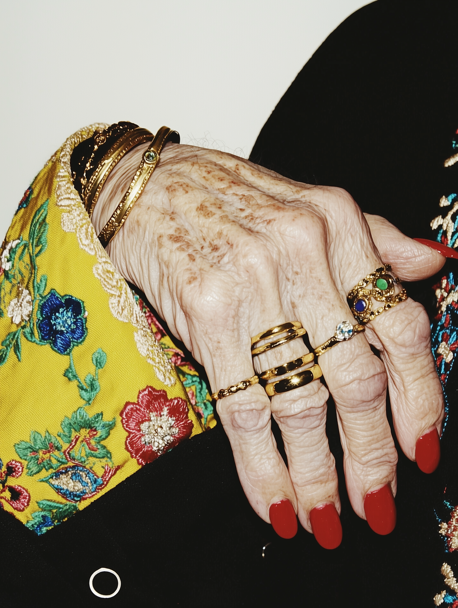 Close-up of an elderly hand with gold jewelry, red nails, and vibrant floral fabric, blending vintage charm with bold elegance.