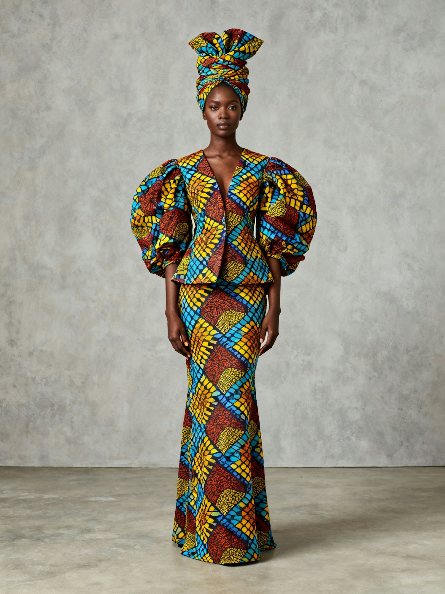 A woman in a vibrant African outfit with puffed sleeves and a matching headwrap, showcasing colorful geometric patterns.