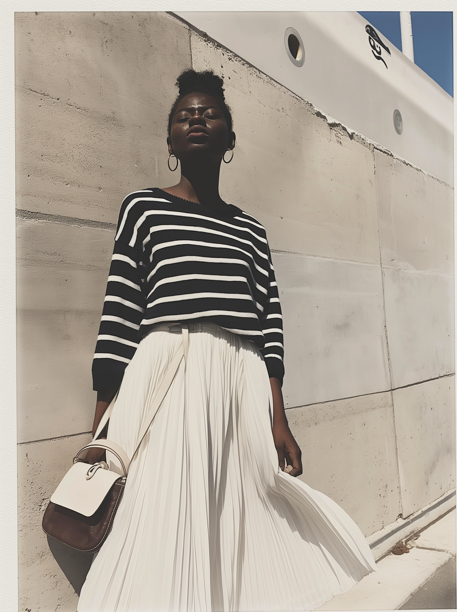 Stylish woman in striped sweater and pleated skirt poses confidently in sunlight against a concrete wall, holding a chic handbag.