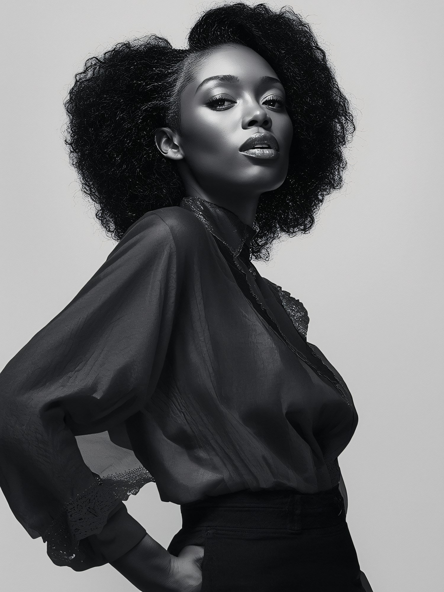 Elegant monochrome portrait of a woman with natural afro hair, wearing a sheer blouse with lace details, exuding confidence and style.