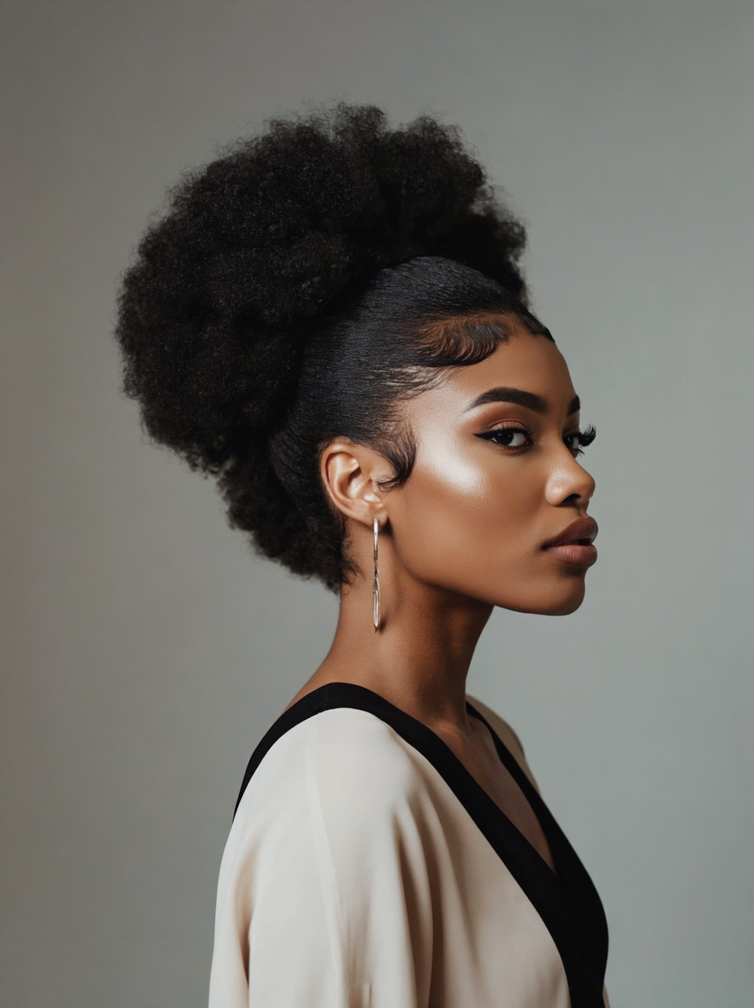 Elegant side profile of a woman with a voluminous afro puff, glowing skin, and hoop earrings, styled with a cream blouse and sleek makeup.