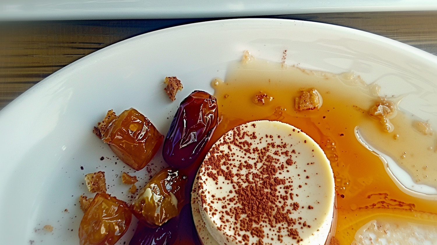 Elegant dessert with cocoa dusting, caramel sauce, and caramelized fruits on a white plate. Sophisticated presentation.