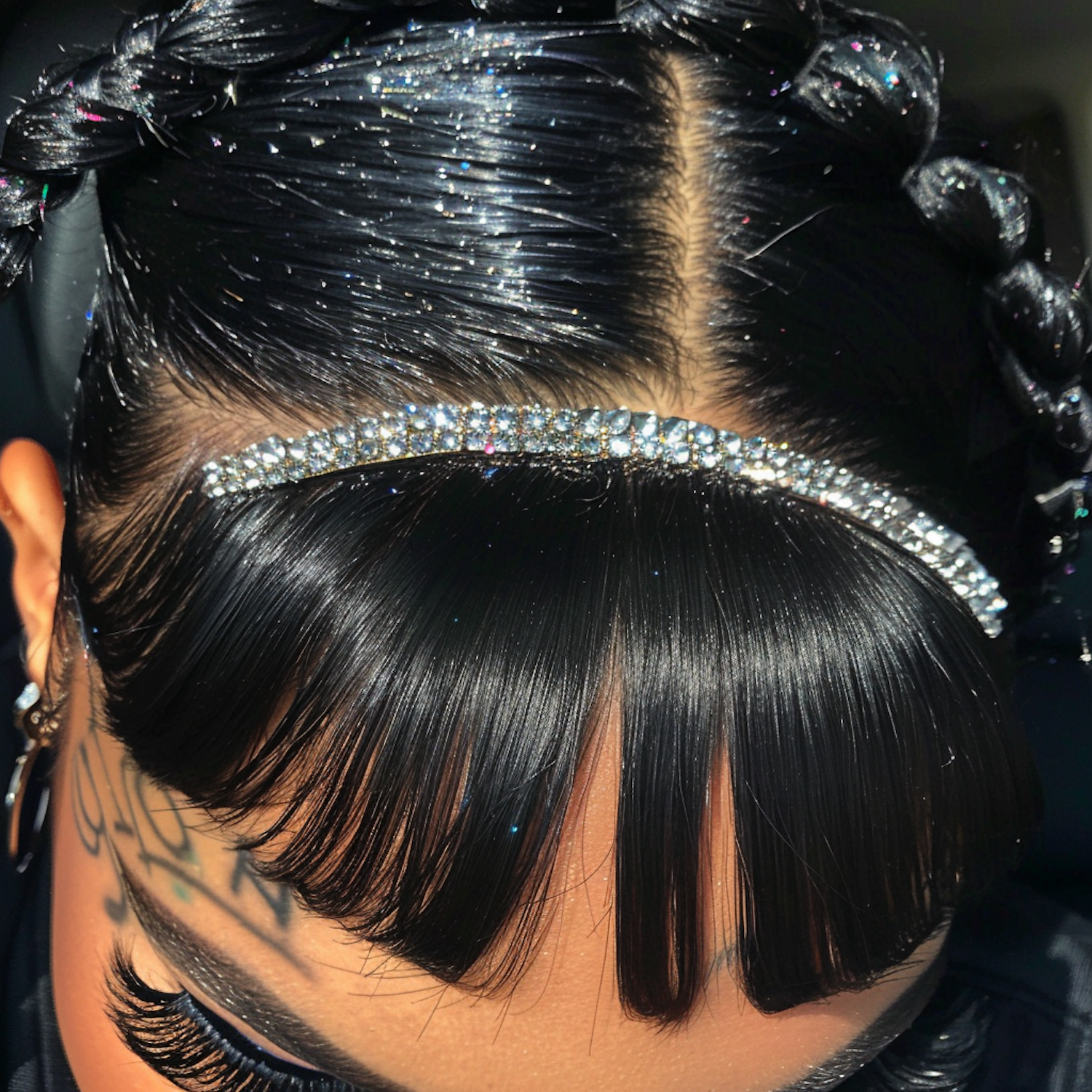 Close-up of a glamorous hairstyle with glittery braids and a rhinestone headband, featuring dramatic eyelashes and a facial tattoo.
