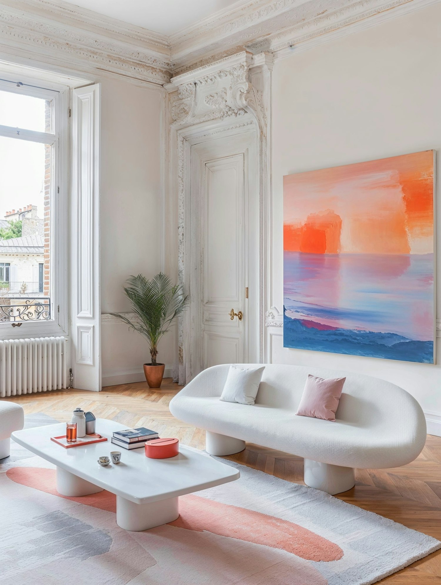 Modern living room with white sofa, abstract art, and elegant moldings. Bright and airy with natural light and stylish decor.