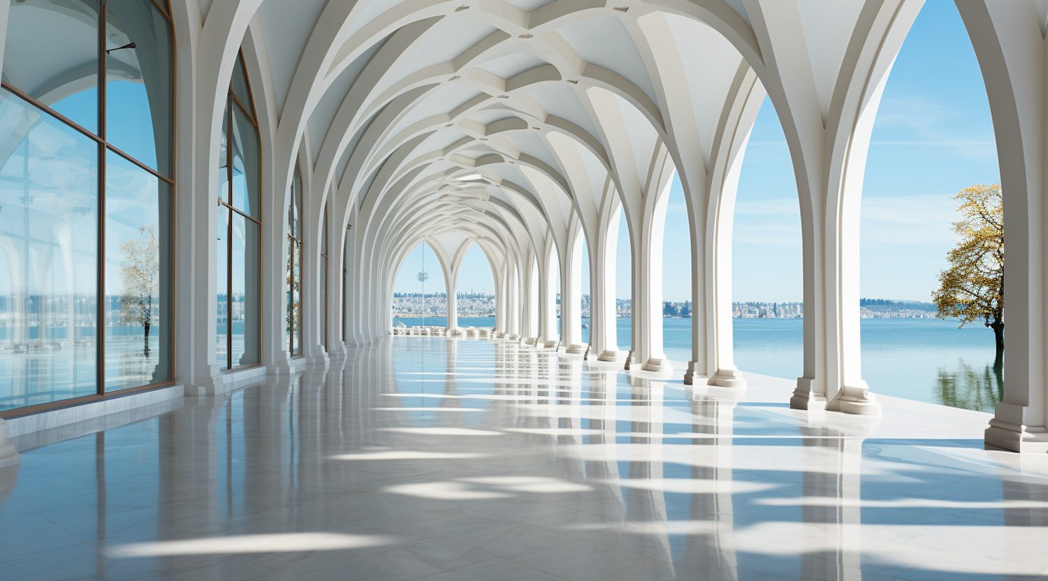 Elegant corridor with white arches, glass windows, and serene water view. Modern architecture with light and shadow play.