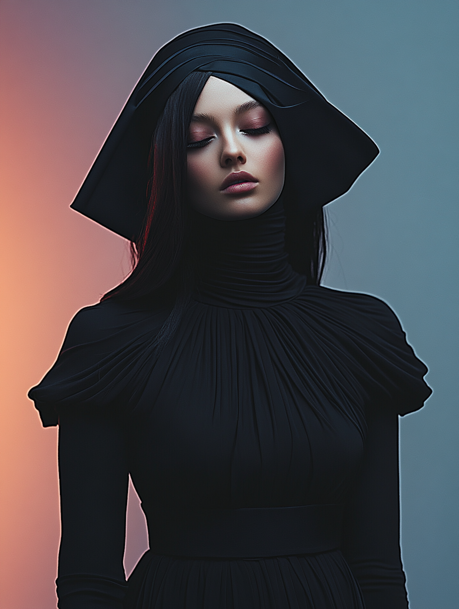 Elegant woman in a pleated black dress and sculptural headpiece, set against a gradient background of warm orange and cool blue hues.