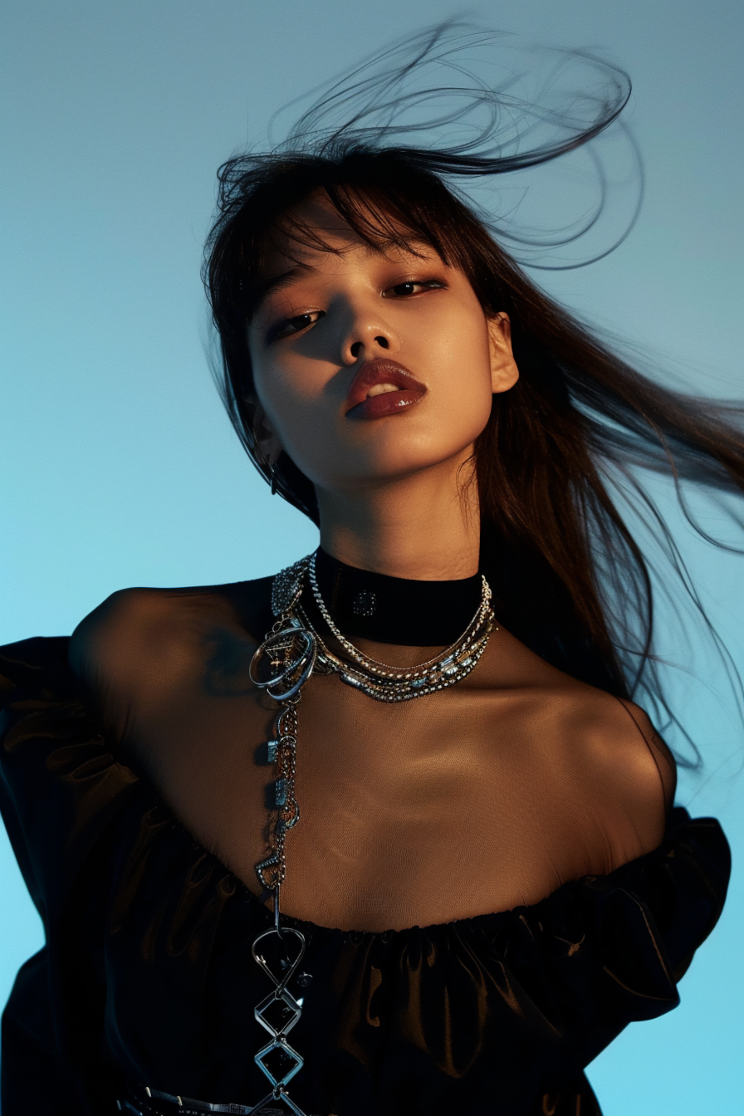 Bold portrait of a woman with flowing hair, deep red lipstick, layered silver necklaces, and a black sheer top against a blue gradient background.