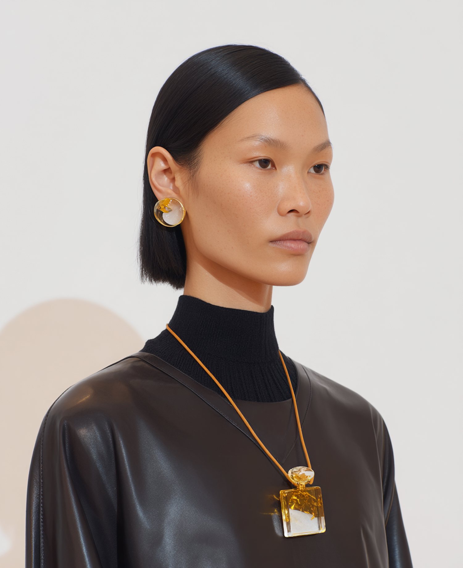 Stylish woman with sleek black bob, bold amber jewelry, and a chic black outfit against a minimal light background.