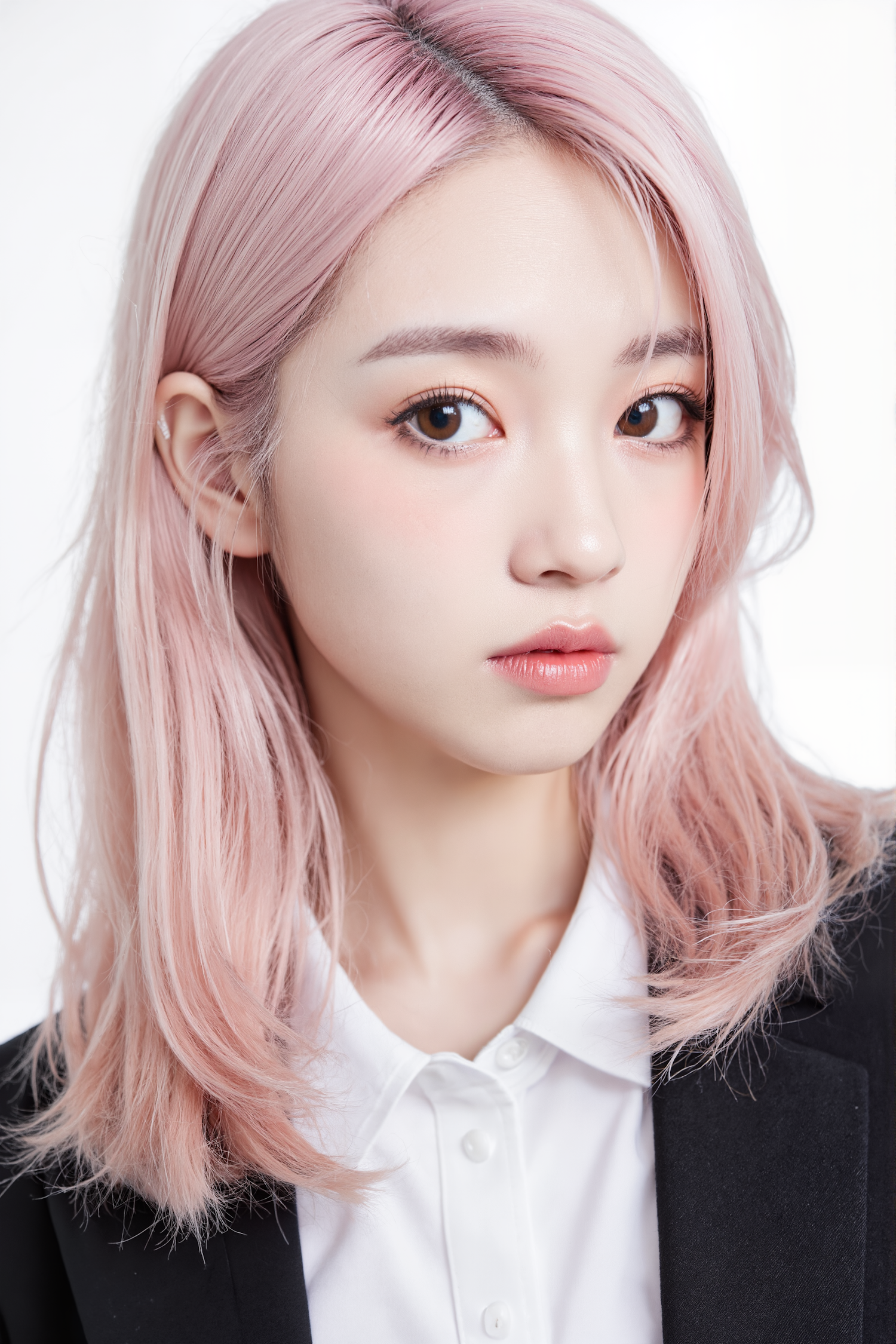Stylish young woman with pink hair, expressive brown eyes, and a polished look in a white shirt and black blazer against a bright background.