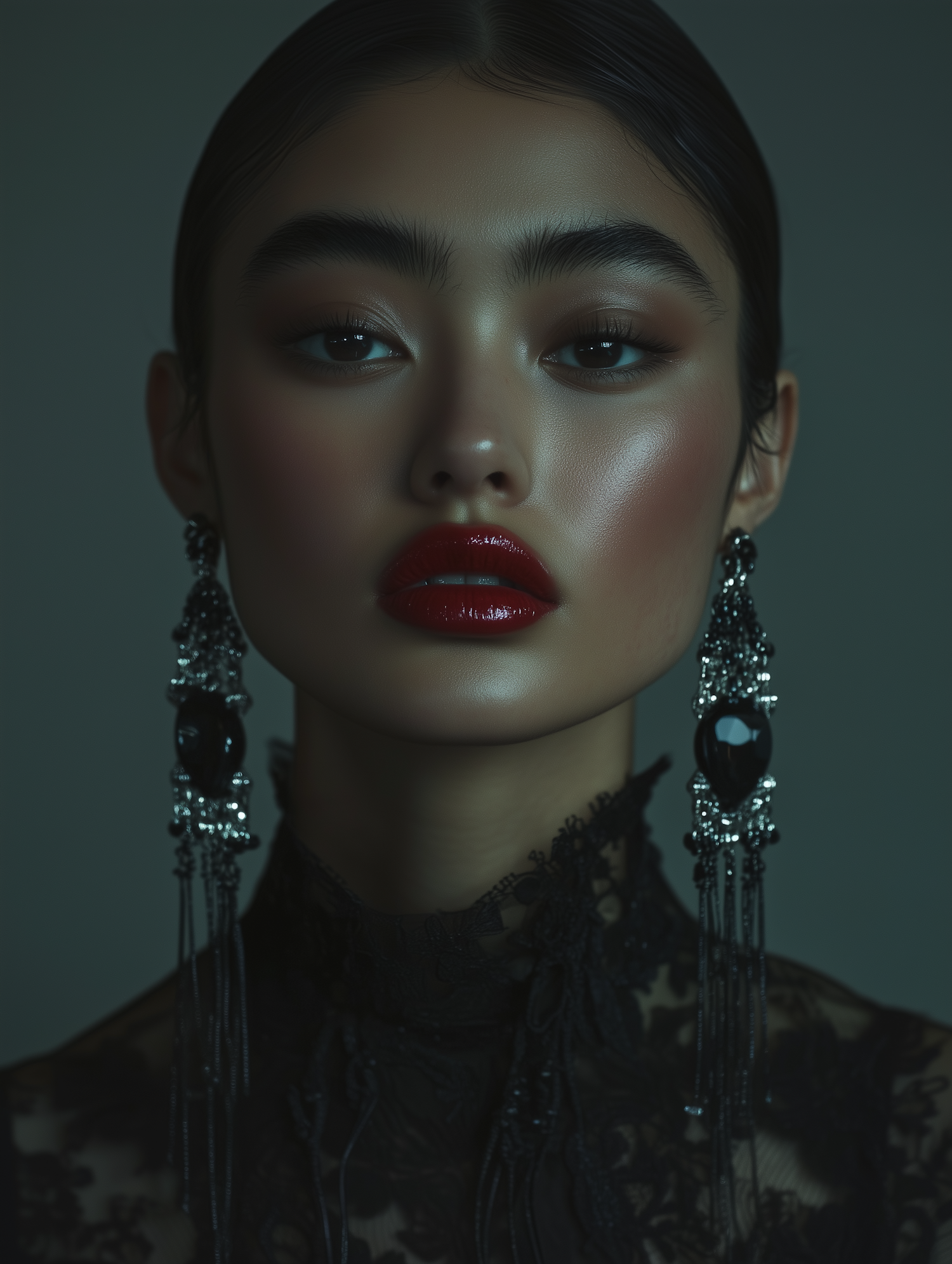 Elegant portrait of an Asian woman with bold red lips, intricate earrings, and a black lace outfit, exuding sophistication and style.