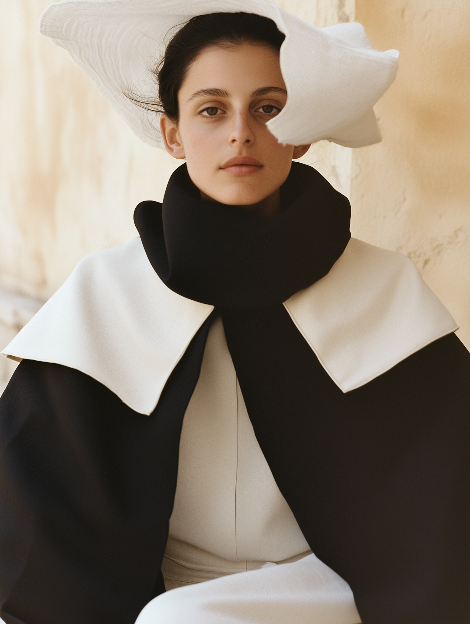 Elegant portrait of a woman in a black and white outfit with a sculptural hat, set against a neutral beige background.