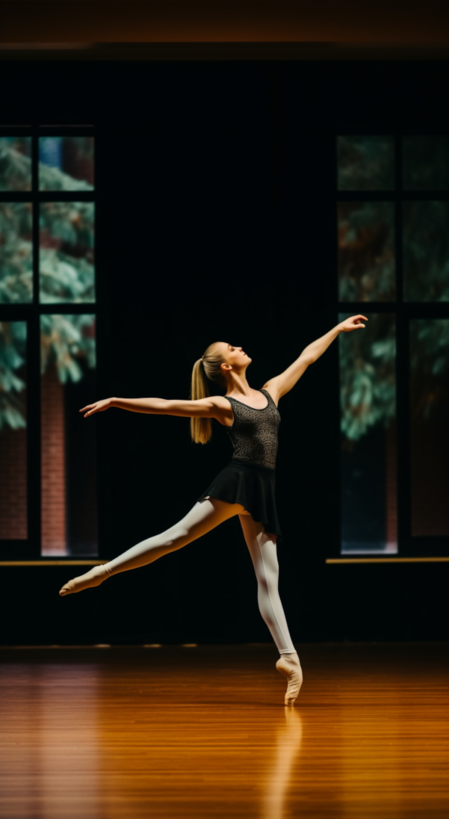 Graceful ballet dancer mid-leap in a studio, wearing a black leotard and white tights, with large windows and warm lighting.
